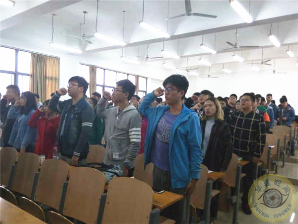 仪式开始后,杨柳上台进行了简短的讲话,对新团员表达了祝贺,提醒新团员要严格要求自己,并对入团新生进行了积极的鼓励,鼓励入团新生满腔热血积极进取,争做优秀团员。随后,会场奏响了共产主义共青团团歌,全场肃立,表达了新老团员对团组织的尊敬和热爱。学工办主任潘晶上台宣读新团员名单,并带领全体到场人员起立奏团歌。之后,14级副书记邓嘉莹带领新团员面对团旗宣读了入团誓言,新团员们集体肃立,右拳过头,宣读了对团的承诺。