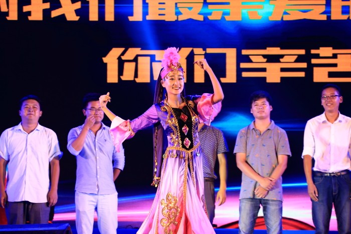 在晚会互动环节,此次迎新晚会主持人、来自新疆的2016级新生艾迪莱教新生辅导员们学习新疆舞,艾迪莱独具异域风格的舞姿和辅导员们憨态可掬的动作形成鲜明的对比,引得在场师生笑声不断。新生代表带着真诚的谢意为辅导员献上美丽的鲜花,将现场的气氛推向高潮。