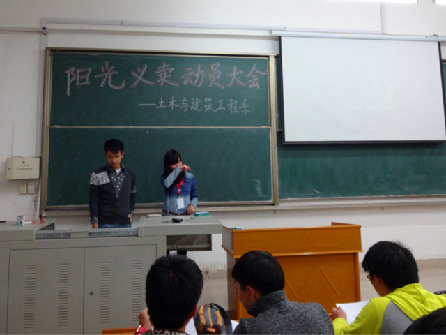 2013年11月6日下午5时40分,土木与建筑工程系青年志愿者协会在三教401举行了土木与建筑工程系阳光义卖动员大会,青协副会长邓圣豪、瞿奕霏主持了大会。土木系青协、全系志愿参加阳光义卖活动的全体志愿者参加了会议。