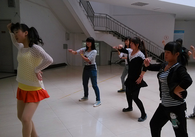 针对没有舞蹈基础的新队员们,领队学姐都会细心的指导。在集体训练之余,学姐还要求队员利用练习以外的时间对照视频熟练教过的动作。大家都十分重视此事,每天均同学们提前到场并认真练习。特别引人注目的是,参与其中的还有三名土木系的男生正在为不久的迎新晚会积极地做着准备,相对女生,动作虽然略显慢拙,但是仍一招一式在努力练习,不落人后。成为训练场上一道“亮丽的风景线”。