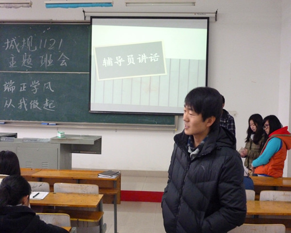2012年12月17日下午14:00,城规1121班在1教505举行了学风建设月主题班会,“端正学风,从我做起”是这次班会的中心话题。出席此次班会的有12级辅导员潘鹏飞、城规1101班班长冯胜伟、12级学习部副部长、各班学习委员及城规1121班全体同学。