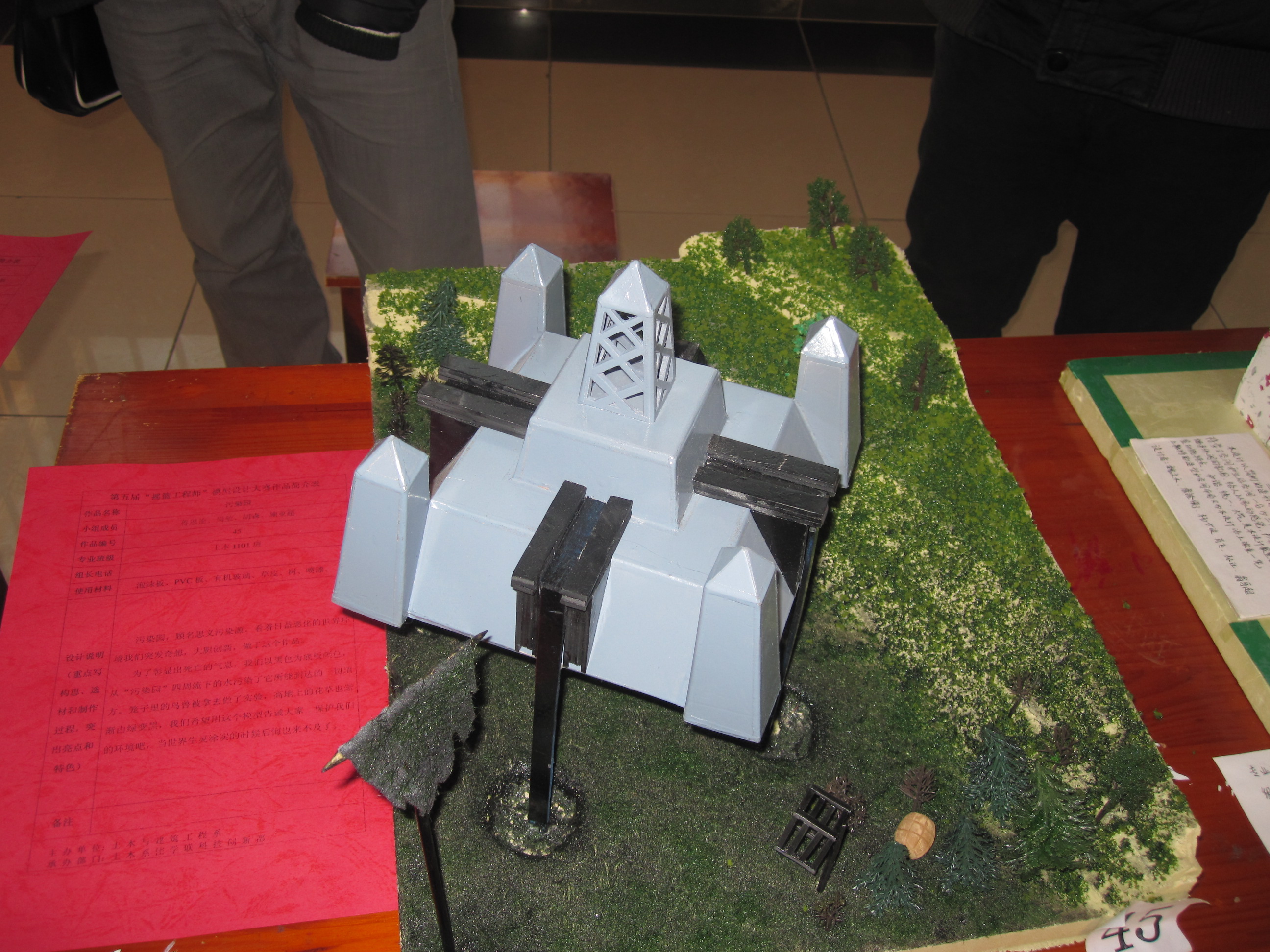 本次模型大赛的主要参赛队伍是我系大一、大二两个年级的学生们。参赛作品充分展示了同学们丰富的想象力和极佳的创造力。其中就环境保护问题,土木1101班的同学以“污染园”为主题,通过收集材料设计出一台新型的大型污水净化装置。虽然该模型在整体做工上表现的并不完美,以黑灰为主题颜色不免给参观者带来一种压抑感,但瑕不掩瑜,该模型的出发点很好,相比一个又一个精致美观的别墅房子,该模型更加突显出大一新生的无限创造力。
