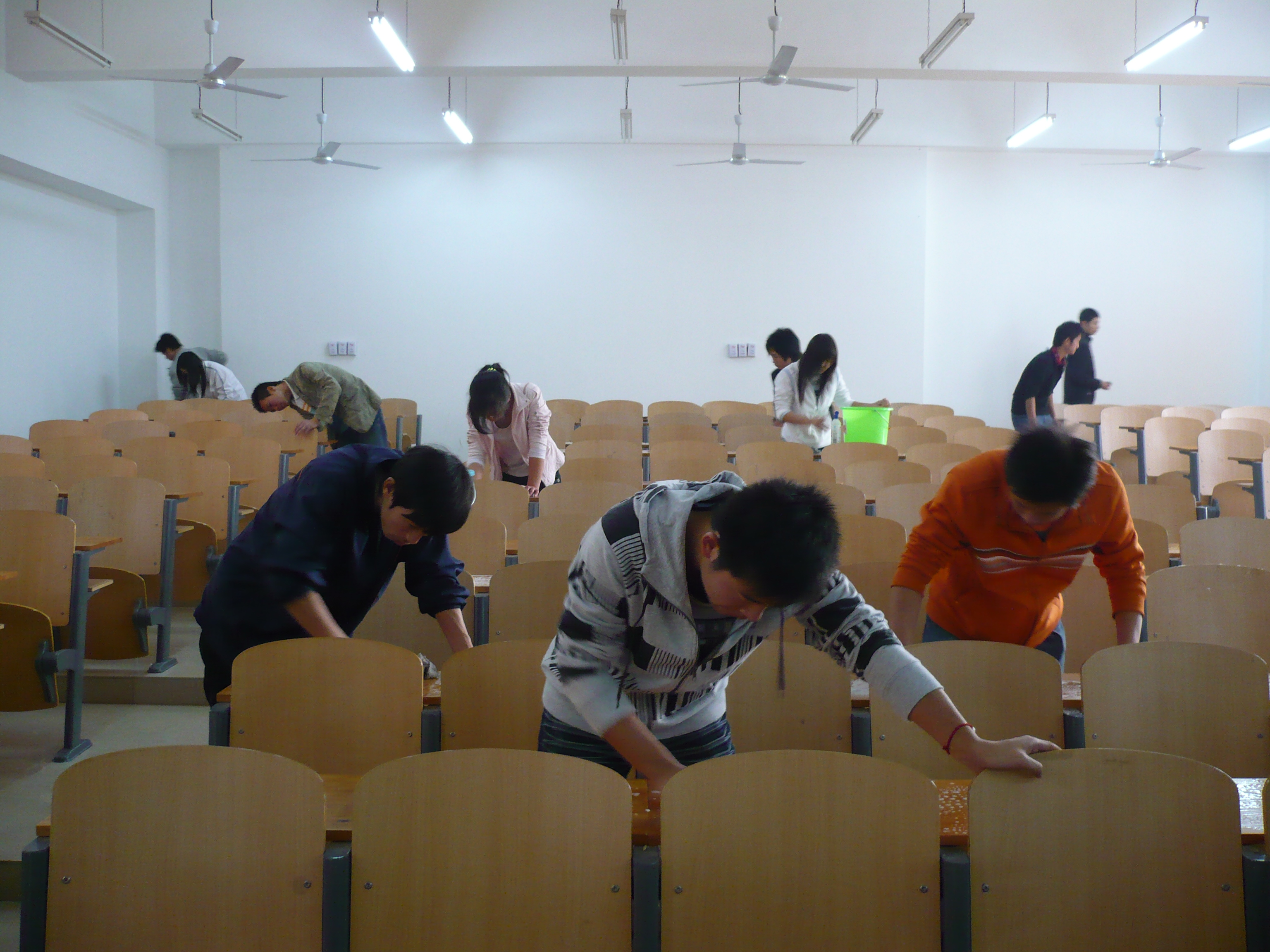 根据我系“学风建设月”实施方案的要求,我系心协负责的“创建文明校园、争创文明市民活动”顺利开展。11月15日上午8:00,我系大一各班总动员,在学校二教开展了“清除‘课桌文化’义务劳动”活动,为美化我们的校园贡献出了自己的一份力量。