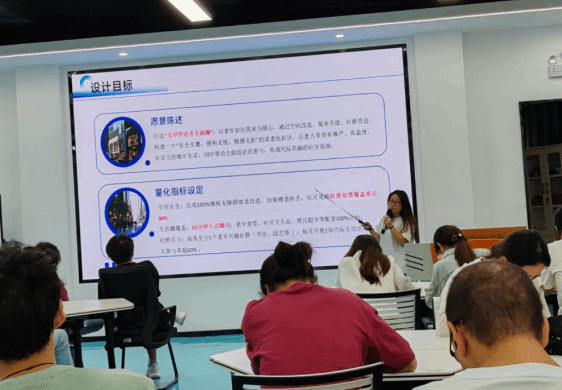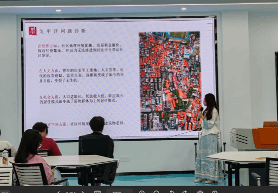 各小组依据任务书要求,在扎实的实地调研与问卷调查分析基础上,针对戈甲营0.15平方公里范围内的老旧街巷与建筑遗存,提出了多类型专业方案。内容涵盖建筑测绘与病害整治、消防疏散通道优化、历史建筑保护与展示利用、15分钟生活圈配套设施规划、道路与景观系统提升、基于街巷美学的戈甲营社区无障碍优化设计等方向。郝翠丽老师在汇报前特别强调,每组的展示时间须控制在15分钟以内,要求内容精简、重点突出,既要清晰表达设计理念,也要具体呈现可操作的实施方案。