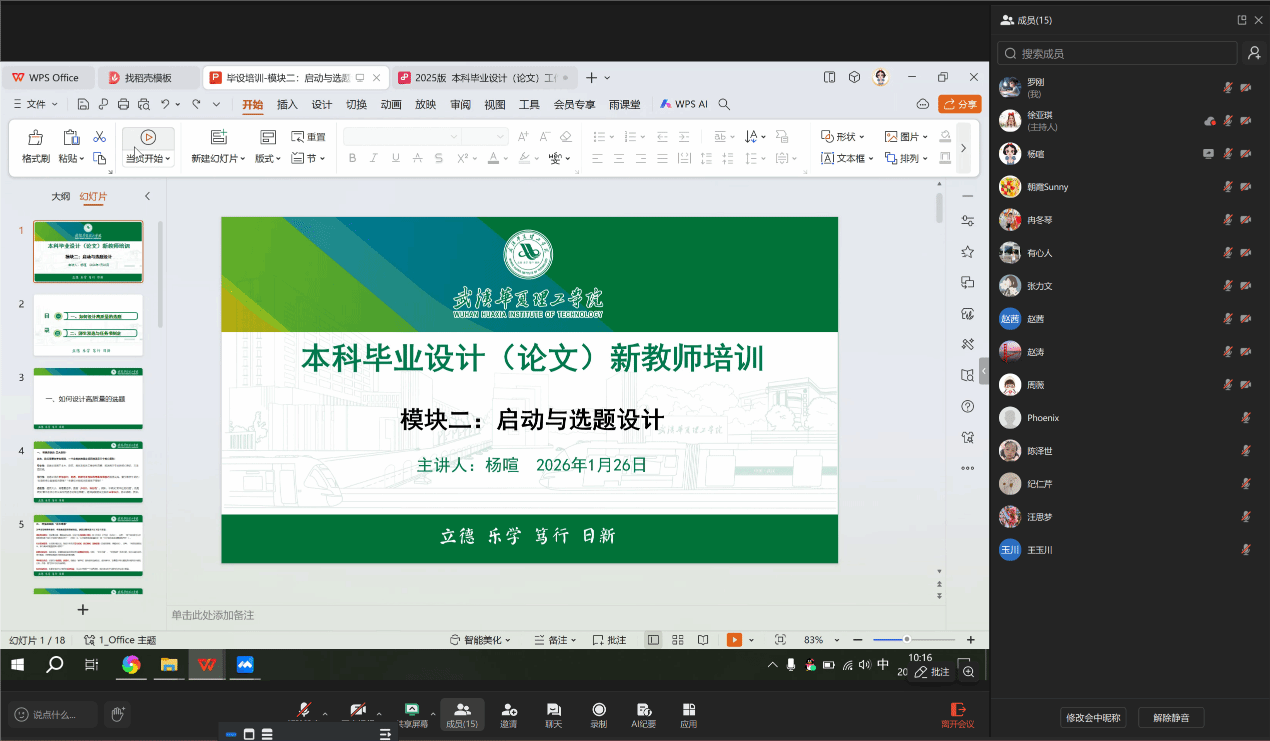 为进一步加强毕业设计(论文)过程管理,帮助毕业设计(论文)指导新教师尽快熟悉毕业设计指导工作,提升指导规范化水平与毕业设计质量,1月26日,我院举办毕业设计(论文)新教师培训会。本次会议由学院副院长徐亚琪主持,杨喧、周薇、罗刚三位老师分别就启动与选题设计、过程指导与沟通、成果评价与答辩进行经验分享。学院全体2026届首次指导毕业设计(论文)新教师及其它感兴趣教师共16人共同参会。