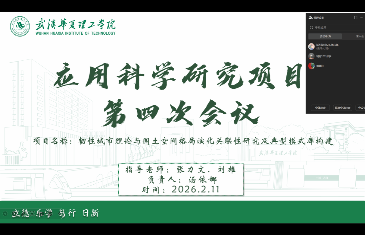 2026年2月11日,应用科学研究项目韧性城市理论与国土空间格局演化关联性研究及典型模式库构建第四次组会顺利举行。土木建筑工程学院城乡规划专业23级汤依娜、张伊,24级傅晨阳共同参与。组会以“分类框架与指标体系”为主题,小组成员围绕韧性研究的分类与指标体系构建展开了深入探讨,并明确了下一阶段的工作任务与分工。