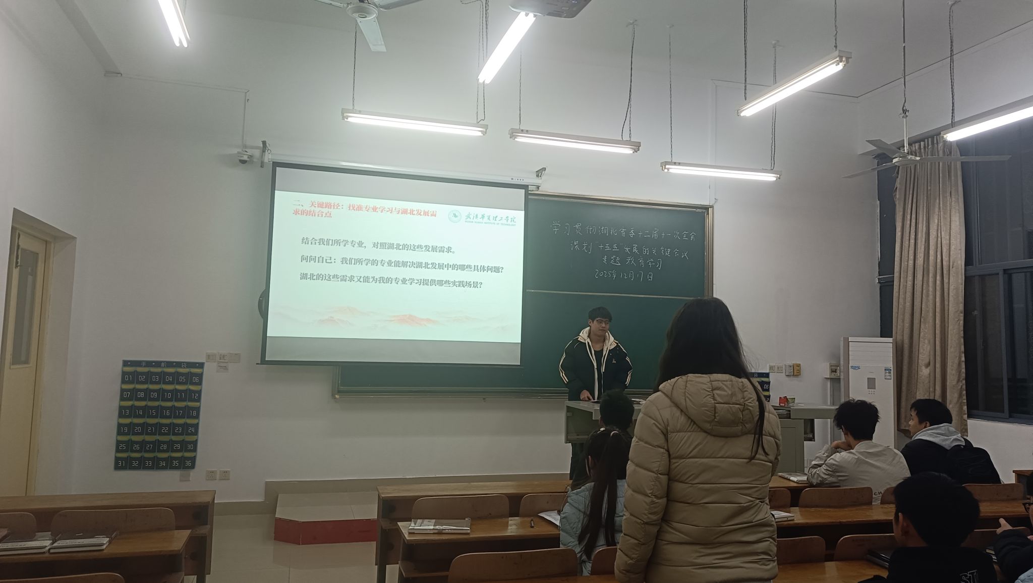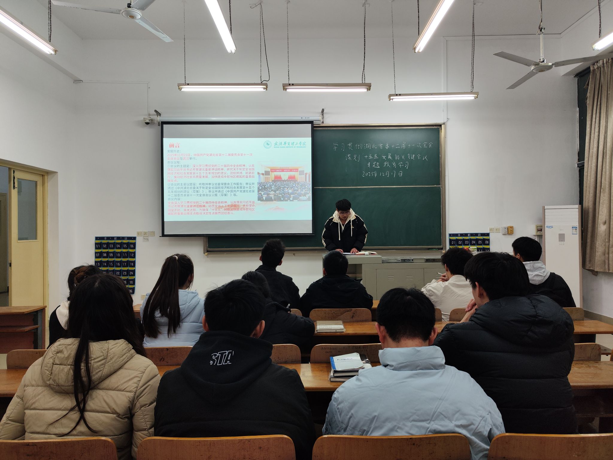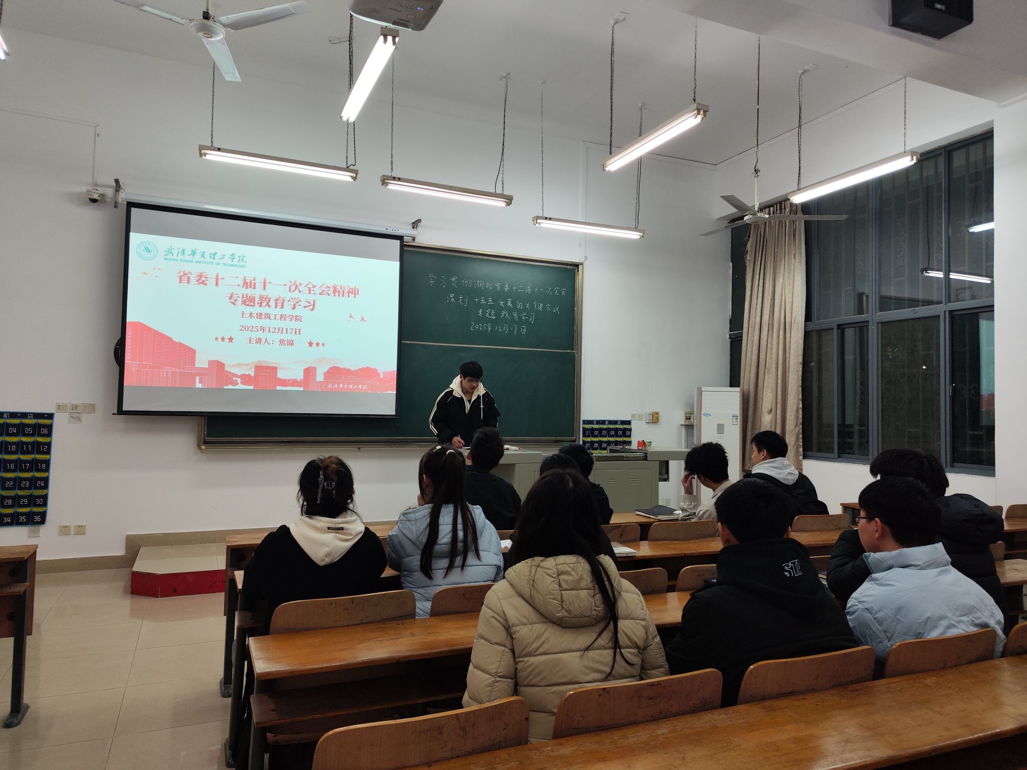 为深入学习贯彻湖北省委十二届十一次全会精神,引导学生党员将个人成长融入湖北“十五五”发展大局与学校建设实践,2025年12月17日17点50分,土木建筑工程学院党员服务站于教学楼 1-102召开十二月理论学习。党员服务站全体成员参会,会议由焦锦同学主持。