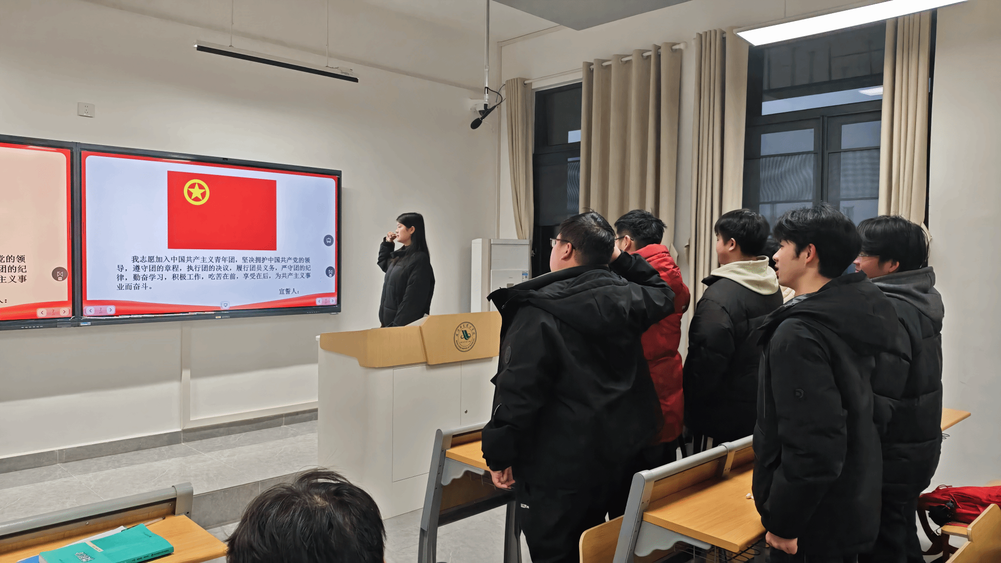 最后,全体团员面向团旗庄严宣誓,重温入团誓词,进一步坚定理想信念,强化团员的责任感与使命感。