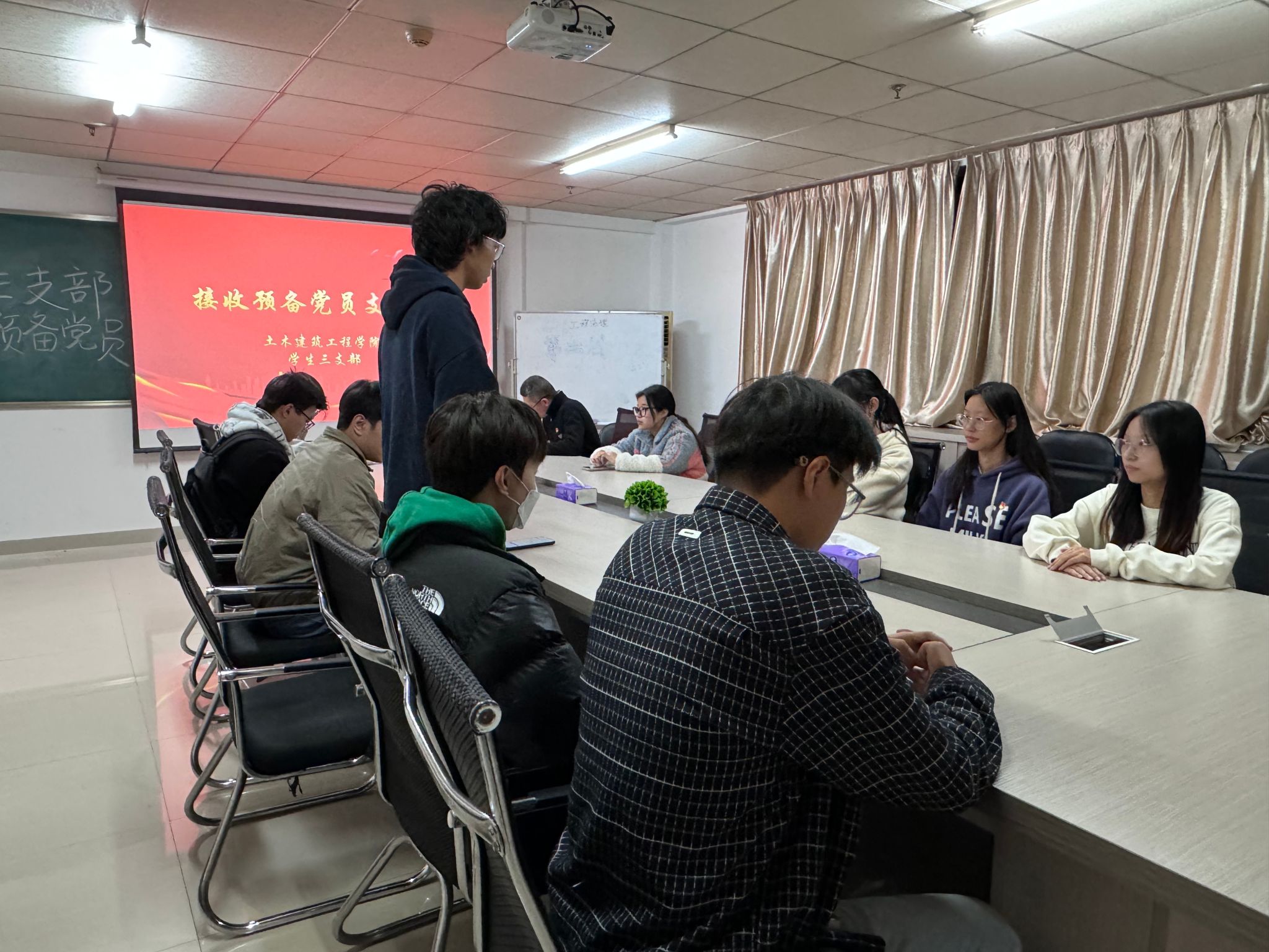 2024年11月26日下午18点,土木建筑工程学院学生第三支部在综合楼1021会议室召开了关于接收预备党员会议,本次活动由第三党支部书记程鹏同志主持,院党总支副书记郝志康同志出席并指导,支部党员余梦雪、周传祺、范楚枫、金伟音、陈思涵、陈蕊、周雨晴、王培悦、曹逸阳、徐靖柔、王家乐、吴洪亮等人参加。此次会议,不仅是对预备党员同志成长历程的一次重要见证,更是学院党建工作深化推进、党员队伍不断壮大的又一里程碑。