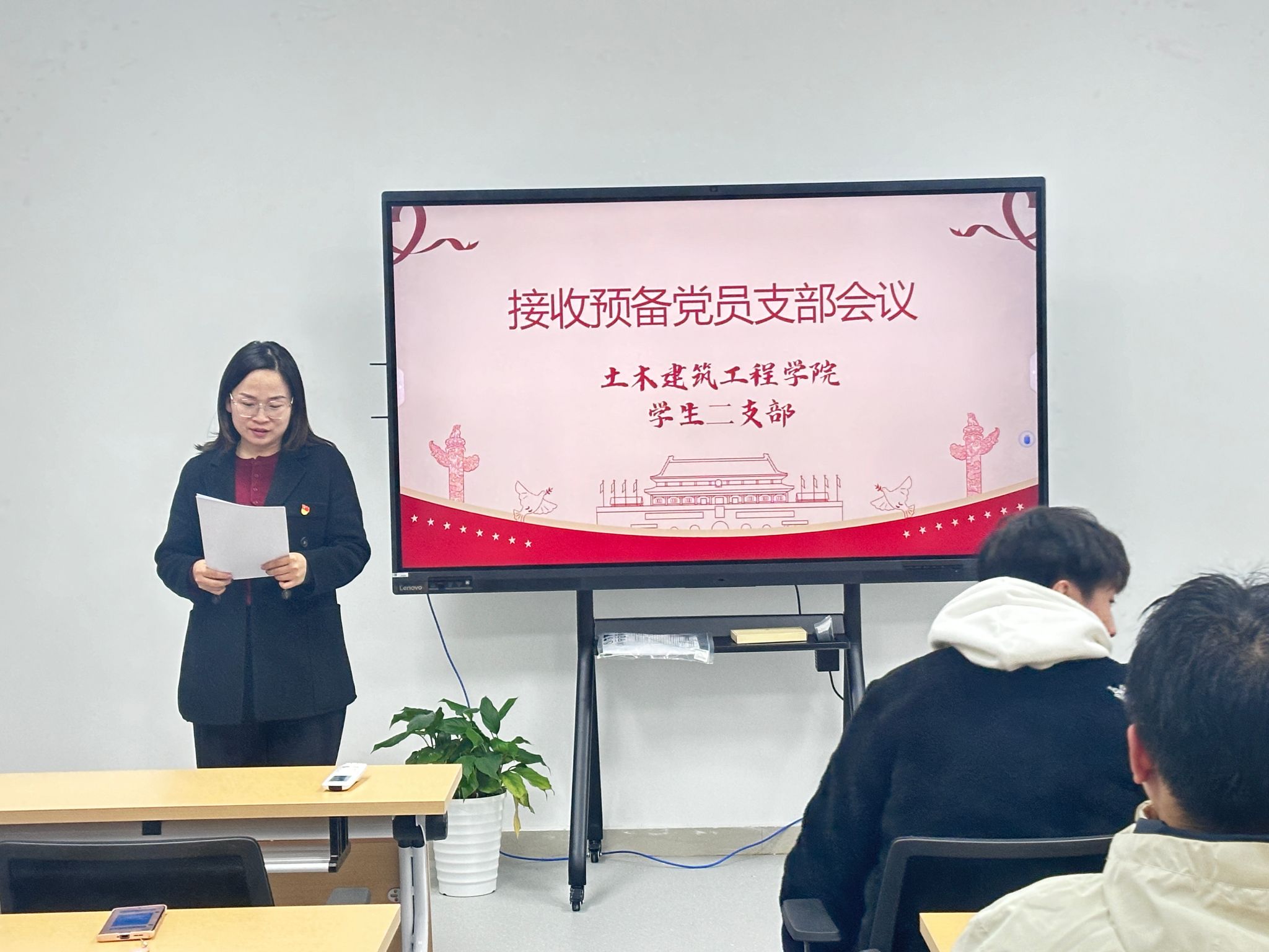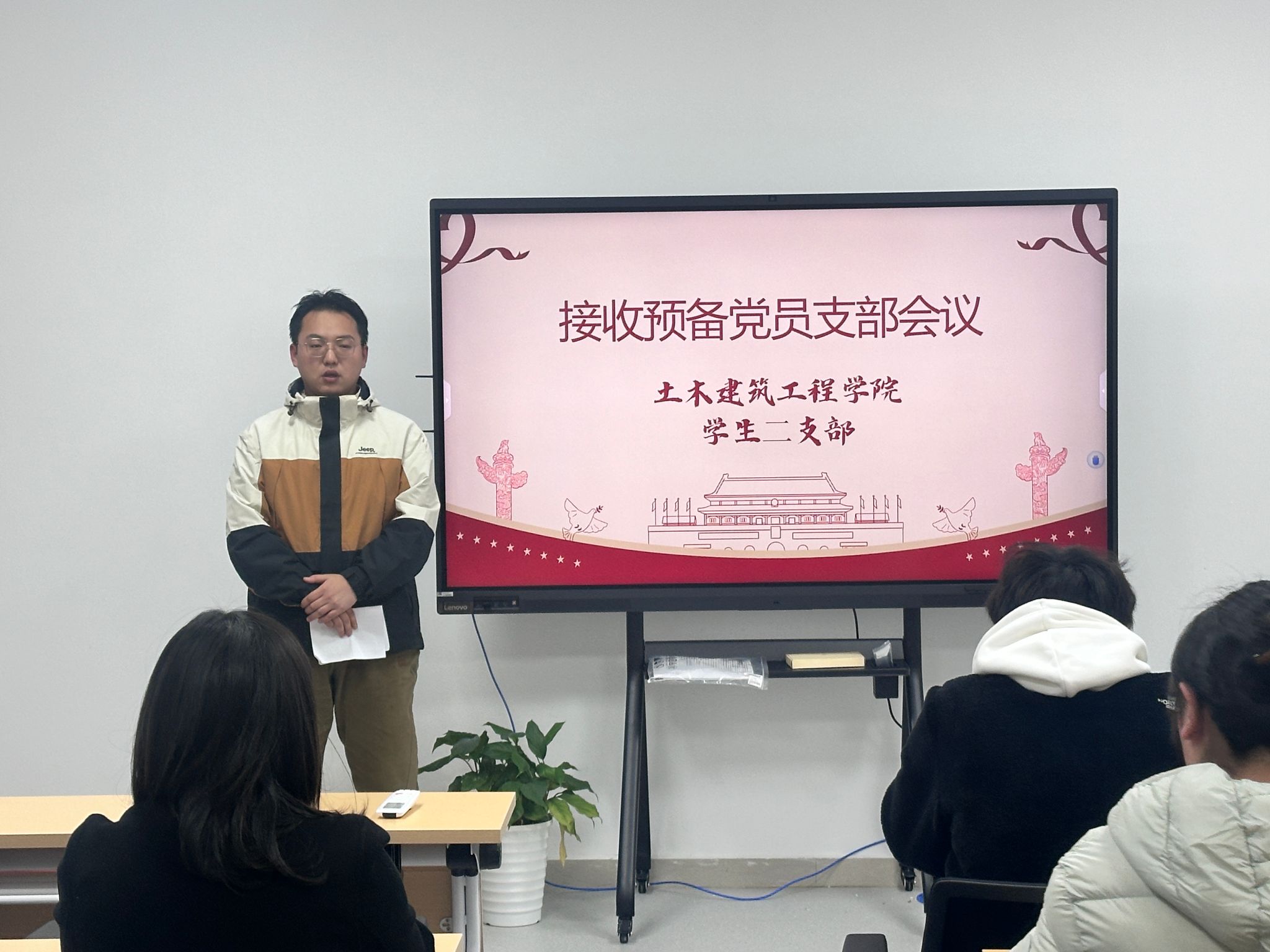 2024年11月26日下午16点,土木建筑工程学院学生二支部在综合楼一楼会议室召开了关于接收预备党员支部会议,本次活动由学生第二党支部书记黄呈主持,支部全体党员参加。