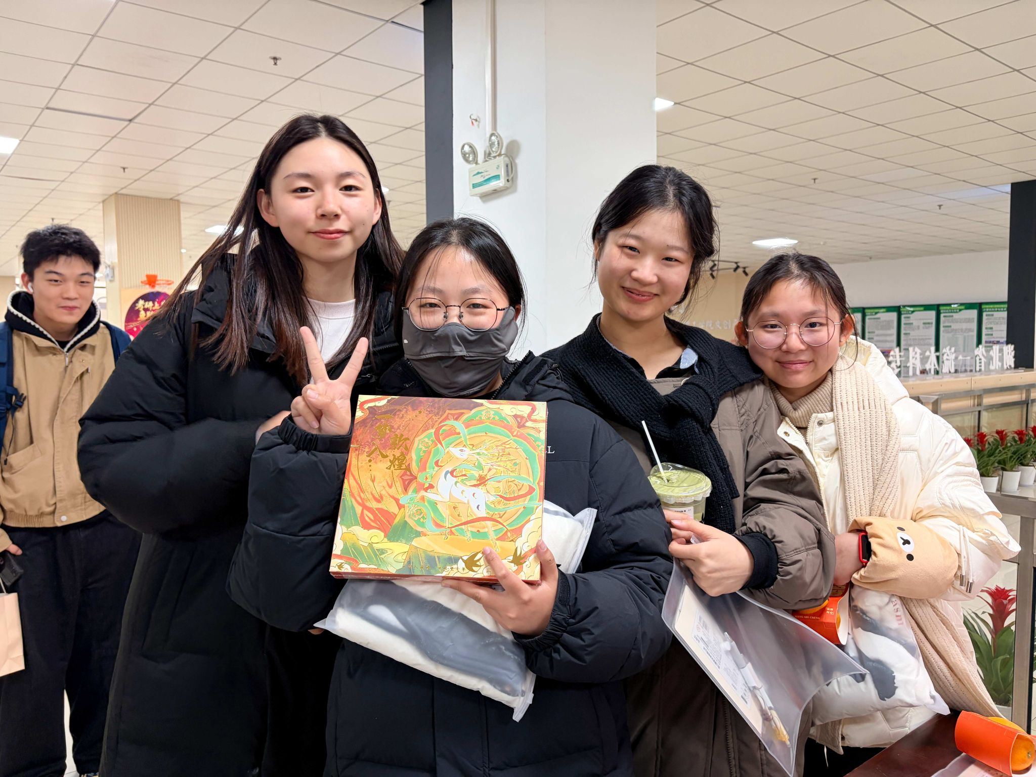 外语学院的余萍萍同学拿着刚到手的“上岸符”毛毯说,“最近晚上在自习室学到很晚,回宿舍路上特别冷,这条毯子不仅能保暖,上面的‘上岸符’图案也让我觉得特别有力量。它不只是奖品,更像是一个承诺——我一定会考上!”