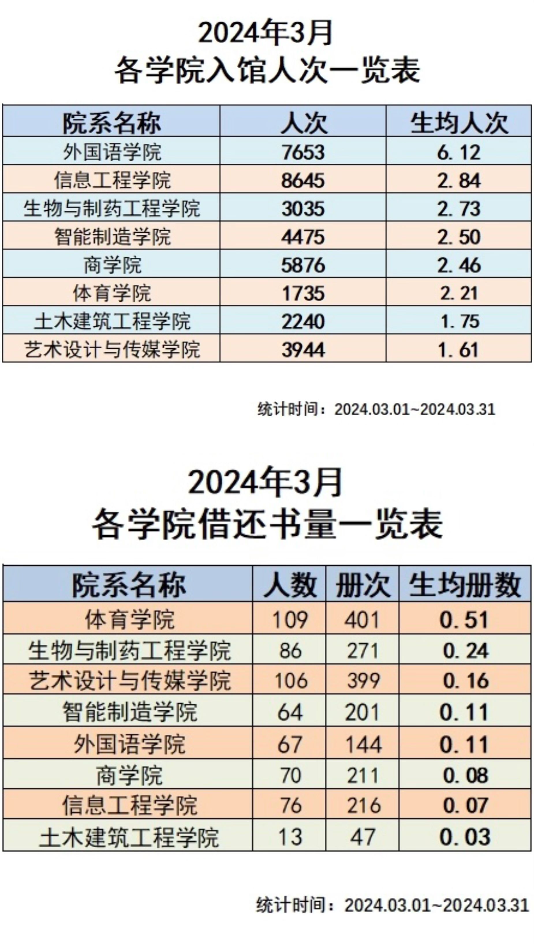 各学院2024年3月入馆及借阅情况一览表