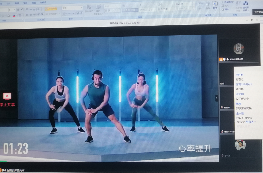 时尚团操是针对体育学院休闲体育专业学生开设的专业技术课程。在线上教学中,继续保持以实践为主,穿插辅以理论指导的教学方式,在授课过程中主要采用分享屏幕讲授理论知识、直播互动进行示范指导、线上重难点答疑解惑、在线直播团队技术展示、线下分组练习模拟教学等形式进行,结合课程的教学进度、教学内容,设置更时尚适用的健身团操进行集体学习。
