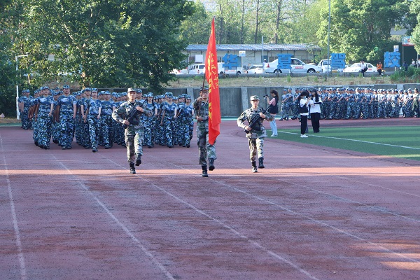 八营十三连的同学更是精神抖擞,每个同学都满怀热情参加本次军训汇演。同学们奋力地踏着脚步,喊出响亮的口号,以最饱满的精神状态向校领导汇报训练成果。压轴出场的教官方阵更是以亮丽的服饰、响亮的口号、整齐的队列、有力的步伐、规范的动作,深深地吸引了全场师生的眼球,赢得了一阵阵热烈的掌声。