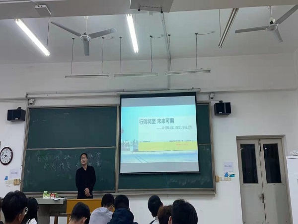 会议开始,陈主任强调了此次会议的主题“行者将至,未来可期”。陈主任首先提出对同学们未来规划的建议,希望同学们以“目标既定,扬帆起航,大胆迈出,不怕失败”八个字为中心,从大一到大四每个阶段都制定好属于自己的目标定位及执行计划。