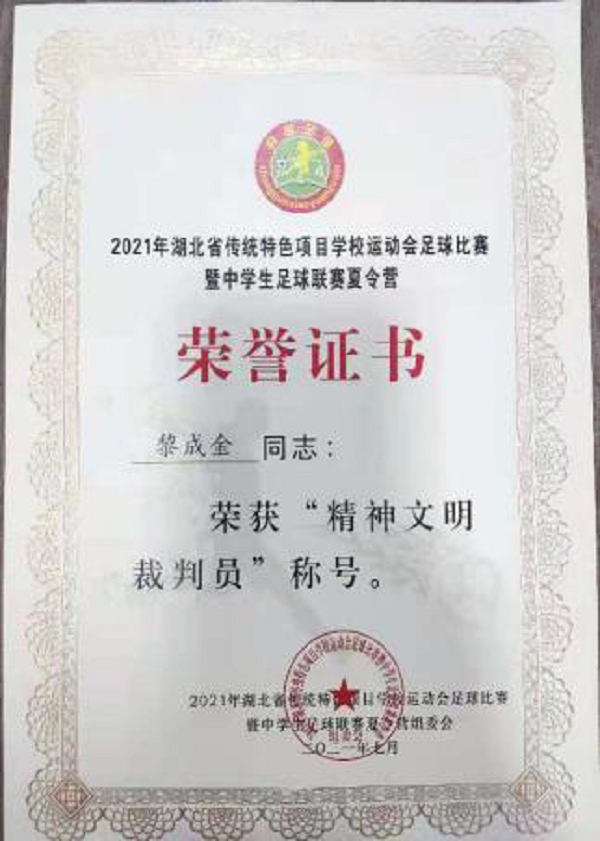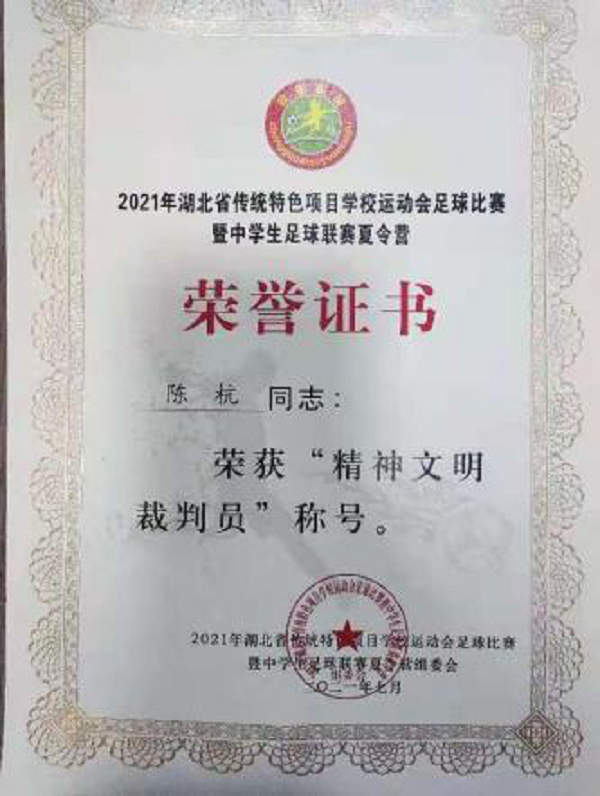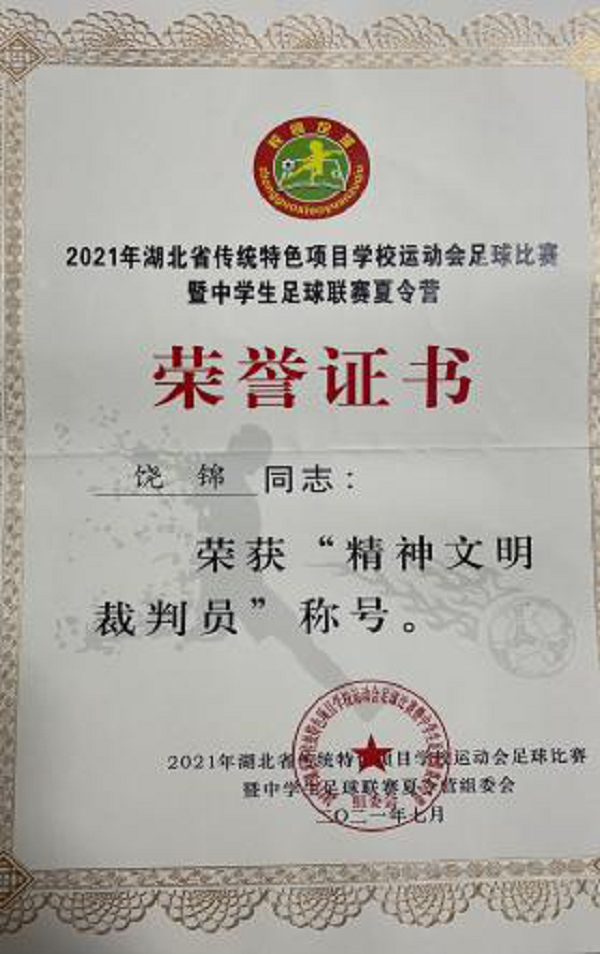 在初中组比赛结束后,我校裁判小组获得组委会专家、领导老师们的一致好评。饶锦、黎成金、陈杭同学在此次裁判工作中表现优异,荣获了“2021年湖北省传统特色项目学校运动会足球比赛暨中学生足球联赛夏令营——精神文明裁判员”称号,给予了极大的鼓励,促使我校学生在以后的学习中更加努力,不断进步,不断完善自己。