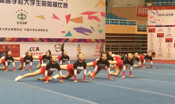 在学院领导的大力支持下,我院共派出20名运动员,在赵燕和彭晶两位老师的悉心指导下,队员们克服了各种困难,在赛场发挥出色,得到了裁判员和各代表队的肯定,最终获得大学甲组技巧一级规定套路第一名、大学甲组花球规定动作第三名的好成绩。