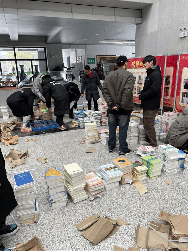 2月25日,新学期开学。下午1点,我院学工队伍的老师带领同学们开始领书。各年级辅导员在核对书目并签字后,和同学们开始了紧张有序的领书工作。