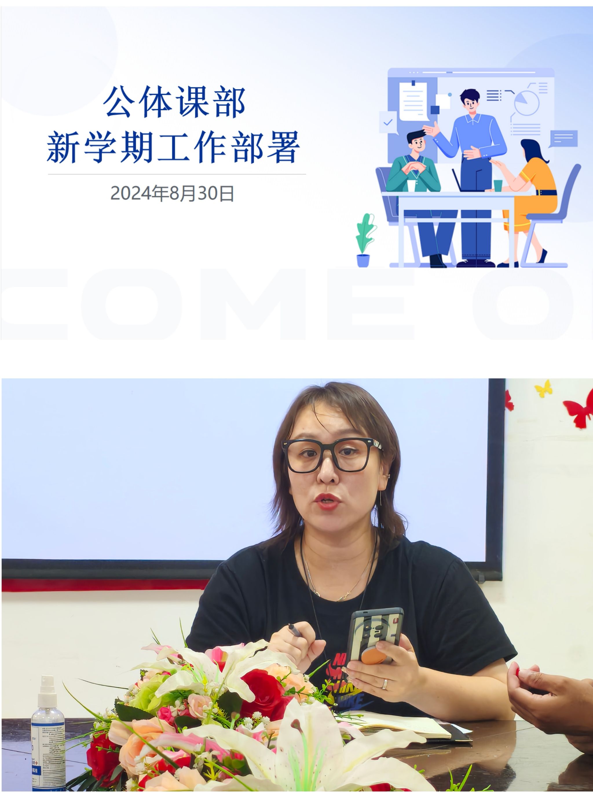 为了深入贯彻落实校领导关于新学期学校体育工作的指示精神,并全面部署公共体育部的工作计划。2024年8月30日上午9:30,体育学院公体课部在田径场教师活动室召开新学期工作部署会议。参加会议的有公体课部全体教师,会议由公共体育课部副主任潘薇主持。