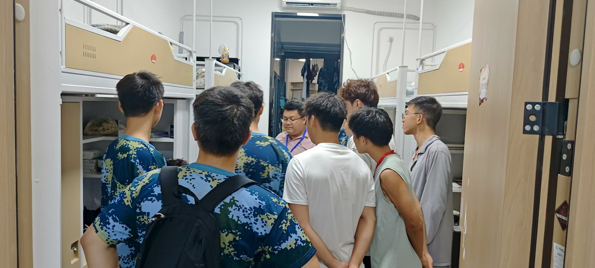 走访团队逐一走访了每一间新生寝室,陈主任与同学们亲切交谈,细致询问大家初来学校的适应情况,耐心解答同学们关于生活和学习的各种疑问。他特别叮嘱新生要互相关心、尽快融入集体生活,并强调了安全意识的重要性,同时陈主任和臧老师向新生的各个寝室代表详细讲解了军训期间的纪律要求、作息安排、注意事项以及着装规范等,希望同学们能以饱满的热情、昂扬的斗志和坚韧的毅力投入到军事训练中,磨练意志品质,展现体育学子的良好精神风貌。