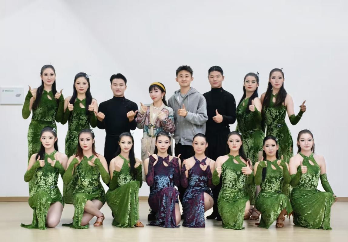 舞台上,《青子吟》以独特编排打破艺术风格界限:伴随悠扬古风音乐,唯美的Led大屏幕,队员们执扇轻旋,尽显东方柔婉;节奏骤变后,拉丁舞步的利落转身与胯部律动无缝衔接,古典舞的清雅与拉丁舞的炽烈交织,每一个动作都兼具创意与张力。而这背后,更离不开近两个月的艰苦训练:古雅辰教练严抠细节,从面部表情、手势角度、转身幅度逐一指导,哪怕0.5厘米的偏差都要求调整,且根据音乐旋律与节奏不断调整编排及队形;李林嵘老师则优化双人拉丁舞组合,从基础步伐训练入手,逐步过渡到眼神互动的配合,经过反复雕琢,最终使双人动作呈现出拉丁特有的默契与张力。队员们也放弃周末与晚间休息,每日开展3小时集中训练,两位老师始终全程陪伴,从动作细节到情绪表达,手把手打磨舞蹈韵味。