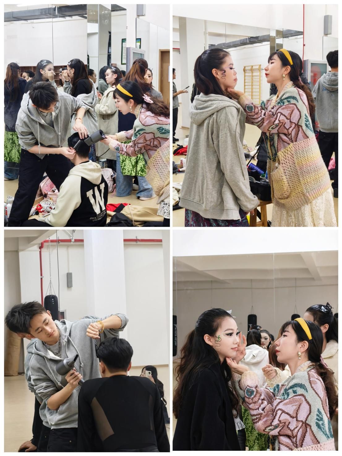 这份惊艳的呈现,始于幕后无数细节的打磨。演出当天下午,体育馆112体操武术室里早已一片忙碌。教练员古雅辰老师手持发梳,为女队员们反复调整发型,并用发胶仔细固定队员们的碎发,还不忘为女生们搭配与舞裙适配的发饰及不断调整眼部妆容;国标课程组李林嵘老师则负责男队员的造型,不断调整发型轮廓,边上发胶边用吹风机固定。两位老师从女生的腮红深浅到男生的发型弧度,每一处都反复确认,只为让队员们以最佳状态站上舞台。