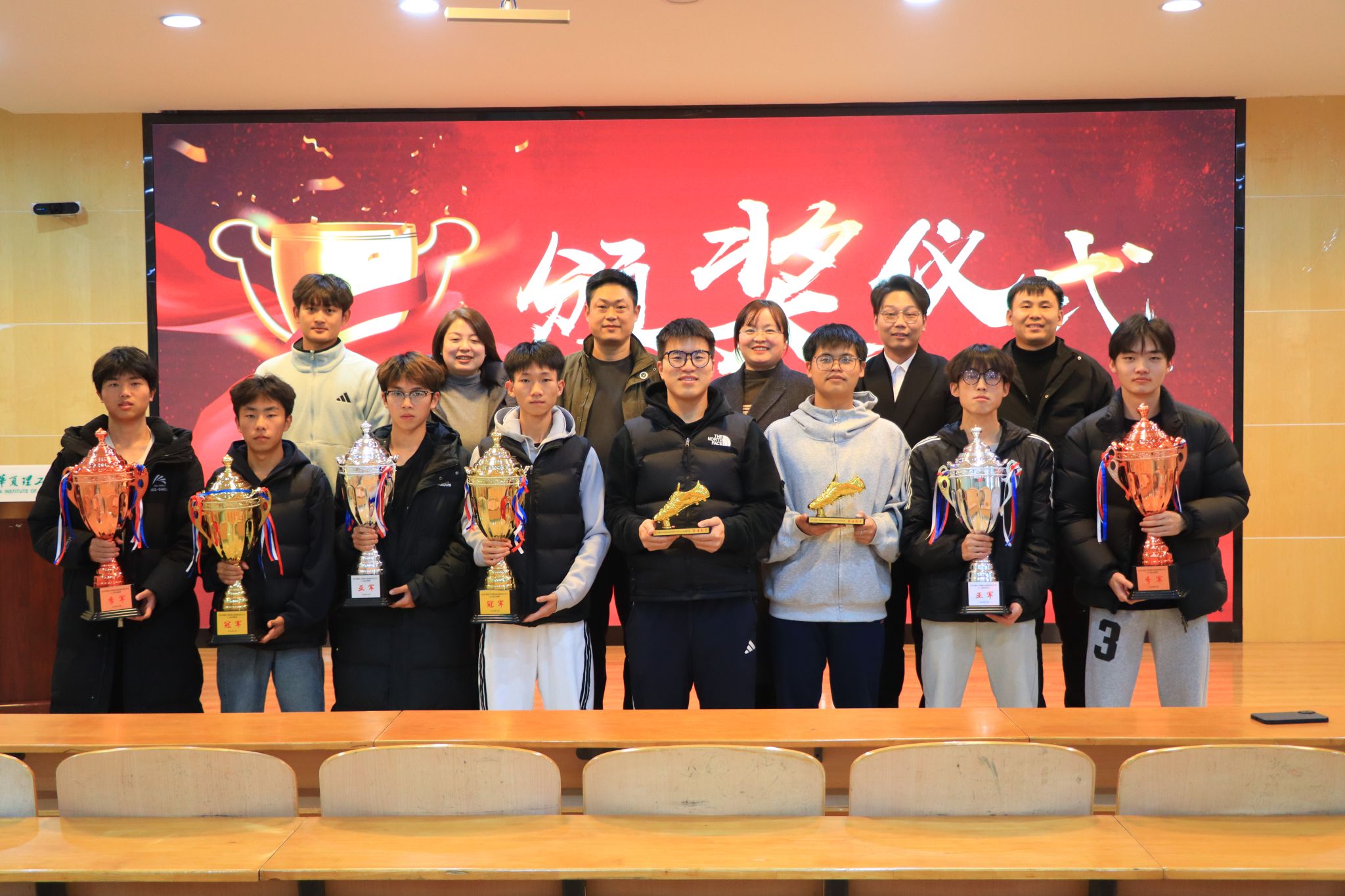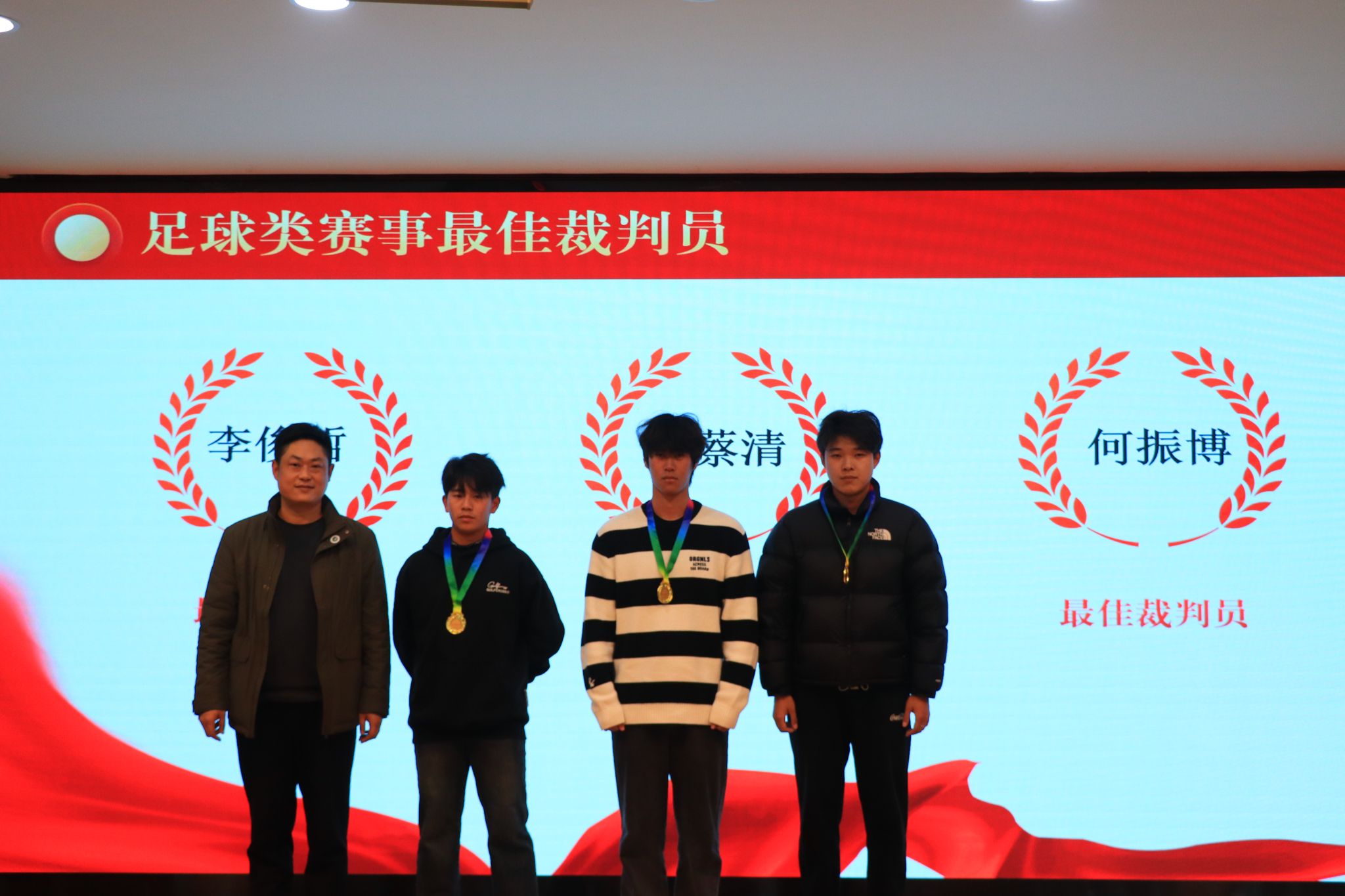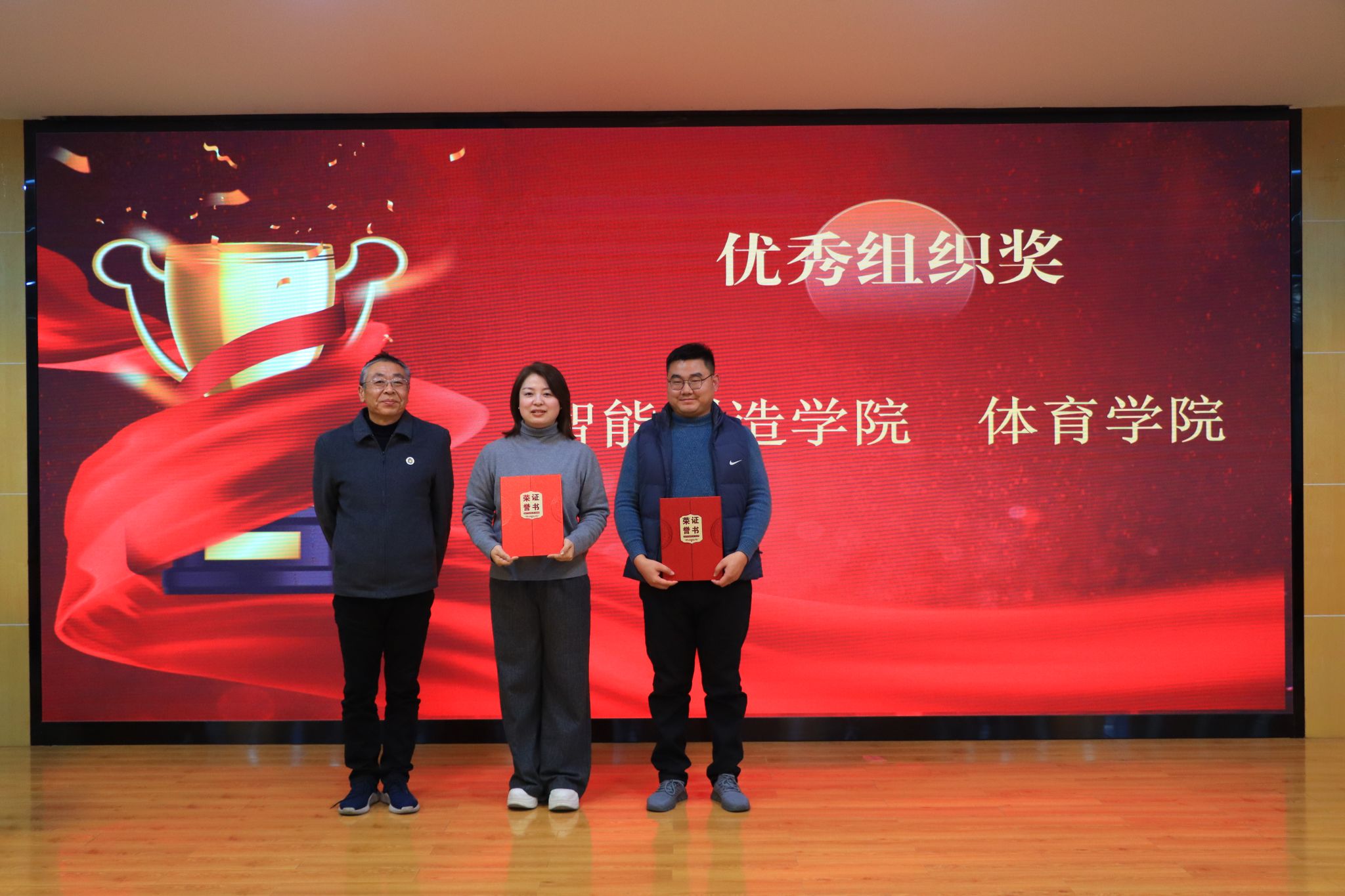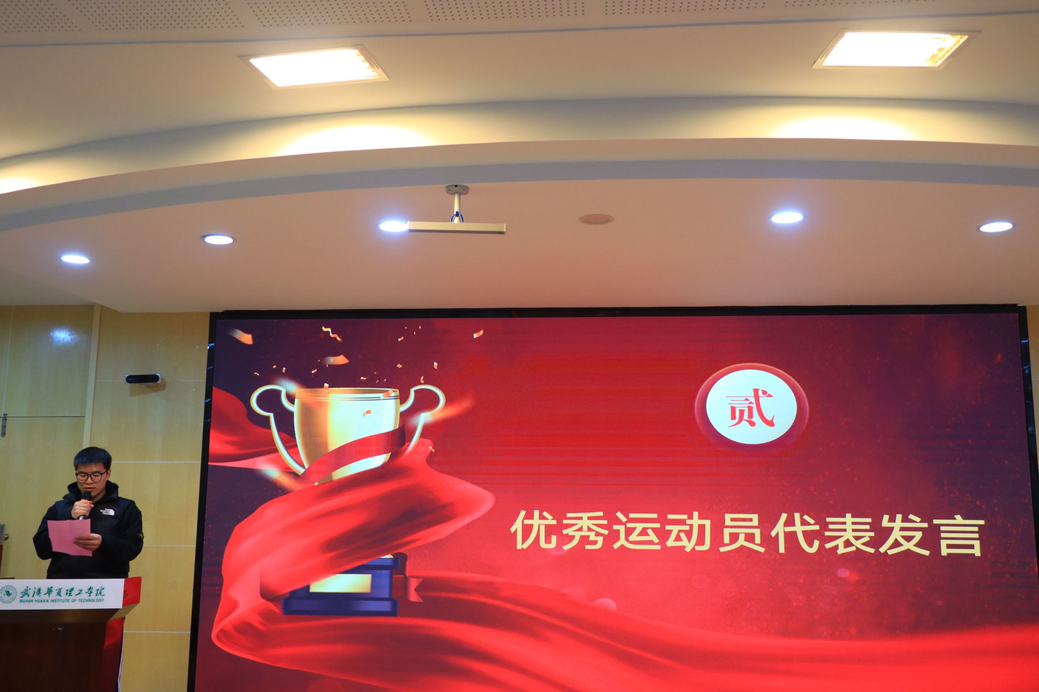 会上,陈伟宣读获奖学生及单位名单。随后的颁奖环节中,获奖代表依次上台领奖,现场掌声不断。商学院蒋帅同学作为学生代表发言,分享了参与体育文化节的收获与感悟。