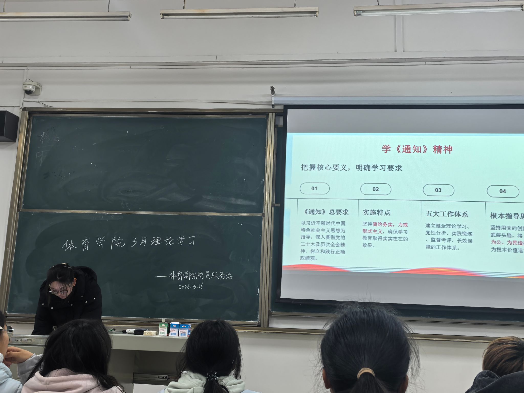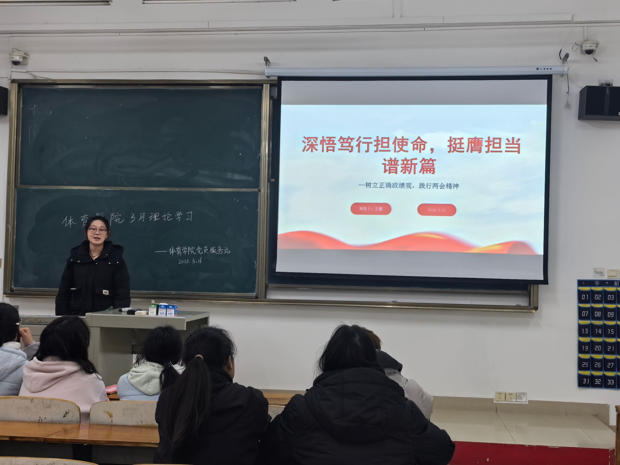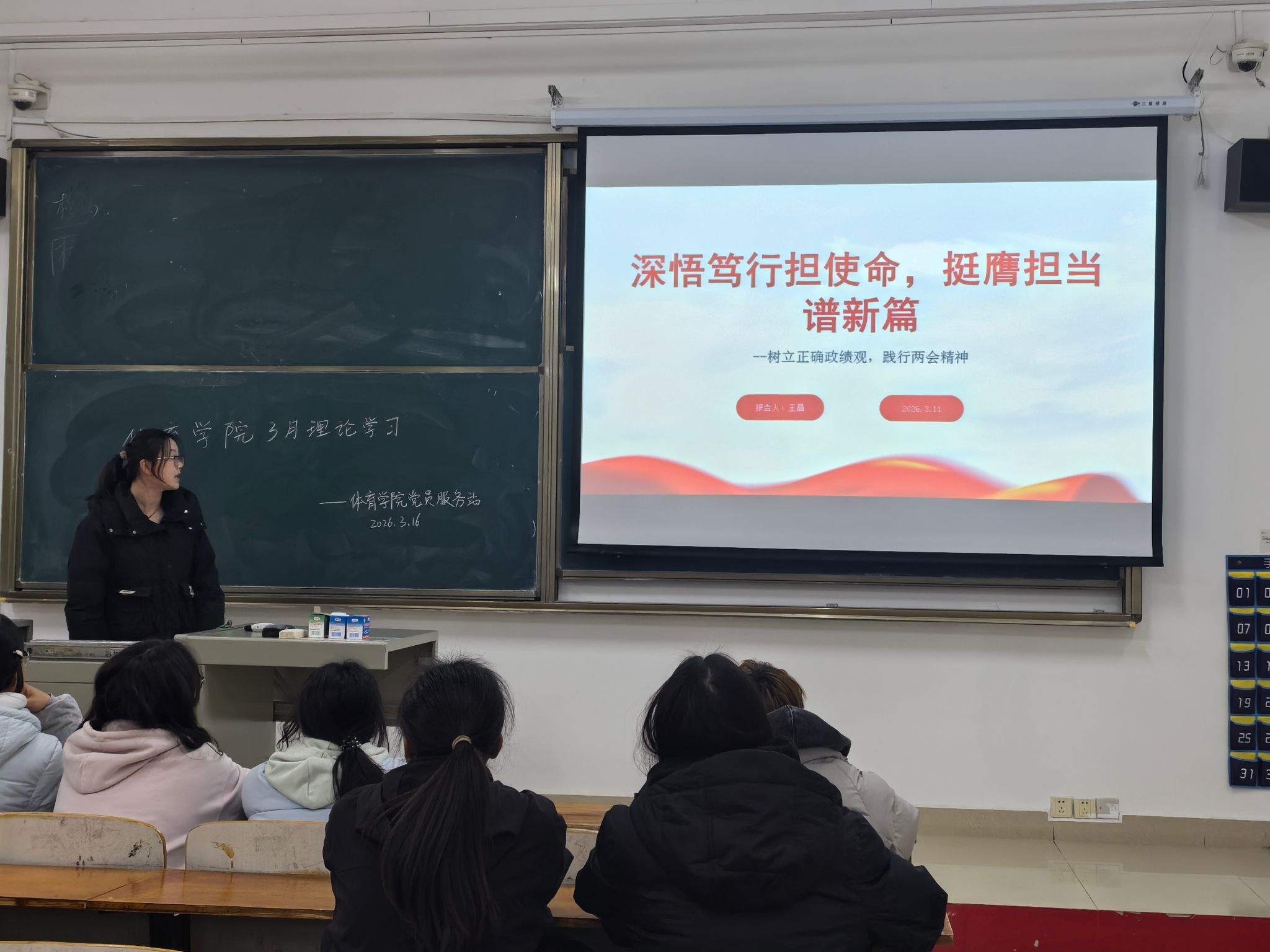 为深入学习领会习近平总书记关于树立和践行正确政绩观的重要论述,认真贯彻落实2026年全国两会精神,3月16日晚,体育学院学生党员服务站于教学楼3-208教室组织召开了“树立正确政绩观,践行两会精神”三月专题理论学习会。本次会议由休体1231班王晶主讲,服务站全体学生党员共同参加,旨在引导青年党员筑牢信仰之基、把稳思想之舵、激发行动之力。