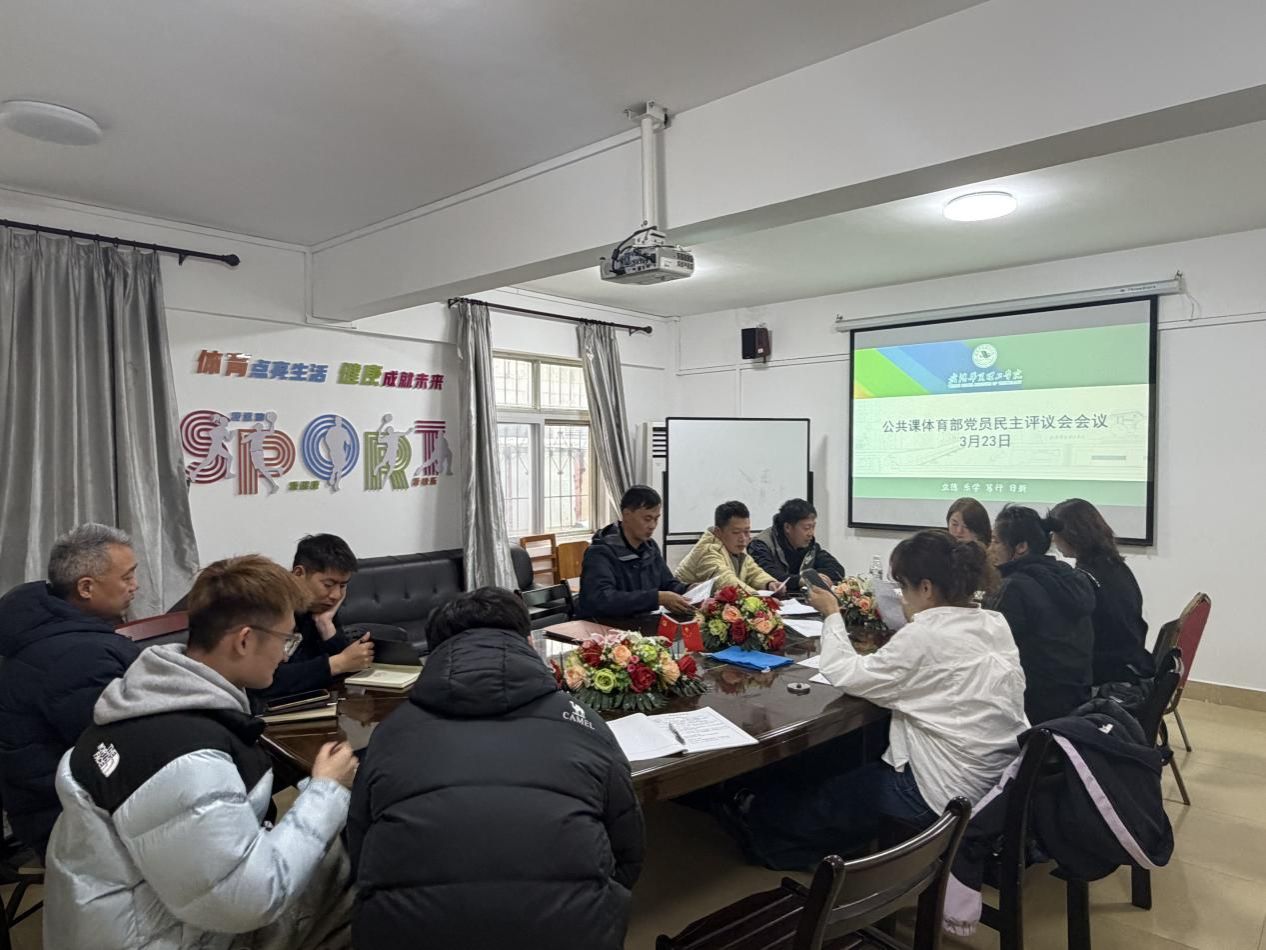 2026年3月23日中午13:20,公共课体育部党支部召开党员民主评议会暨党员业务学习专题会议,全体党员教师参会,会议由支部书记彭文耀主持。本次会议严格落实学校党委工作要求,同步推进支部民主评议、党员互评建言与业务能力提升工作,切实强化基层党组织建设,推动党建与体育教学工作深度融合,各项议程有序开展、成效显著。