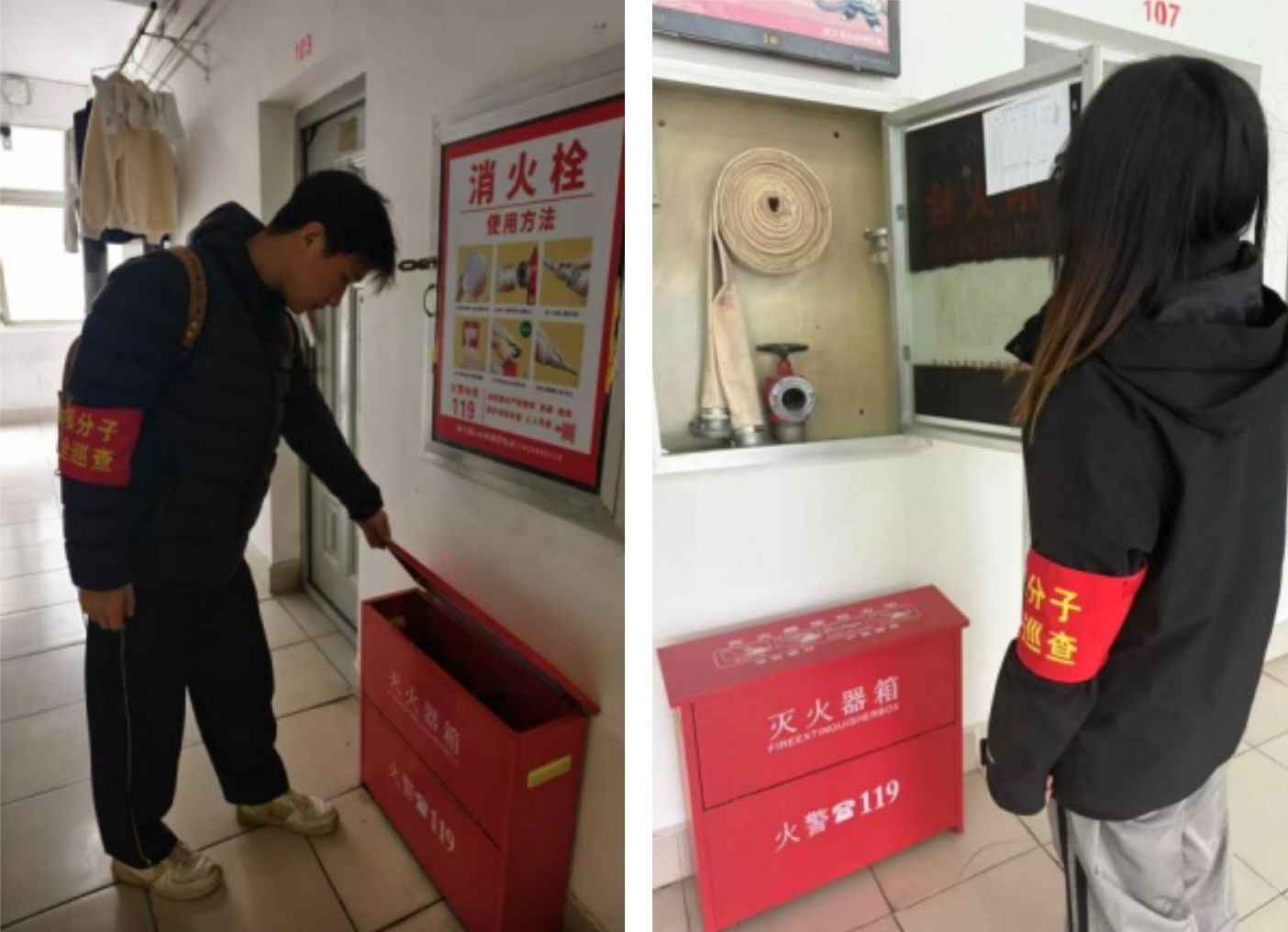 巡查值班期间,学生党员与积极分子佩戴“积极分子安全巡查”袖章,严格按照消防安全管理规范,对宿舍社区内的消防设施进行全面细致的检查。重点排查了各楼层消火栓箱、灭火器箱等关键消防设施,逐一核查消火栓内水带、水枪、阀门是否完好在位、无破损锈蚀,灭火器是否压力正常、铅封完好、在有效期内,同时检查消防标识是否清晰完整、消防通道是否畅通无阻。针对检查中发现的细节问题,巡查人员现场记录并及时反馈给宿管阿姨,建立问题整改台账,形成“排查-整改-复查”的闭环管理,确保隐患清零。