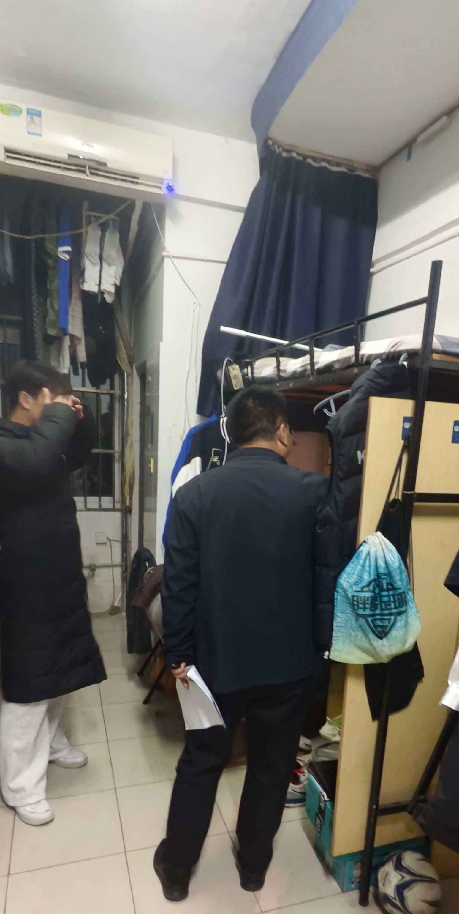 为切实筑牢校园安全防线,规范寝室内务管理,强化学生安全防范意识,12月1日,体育学院开展以寝室内务整改、用电安全及防诈骗宣传为核心的寝室安全专项检查。此次检查由陈世益主任带队,李连国、叶航两位辅导员全程参与指导,对学校2栋、4栋、5栋、8栋学生寝室进行“全覆盖、无死角”排查,精准消除各类安全隐患。