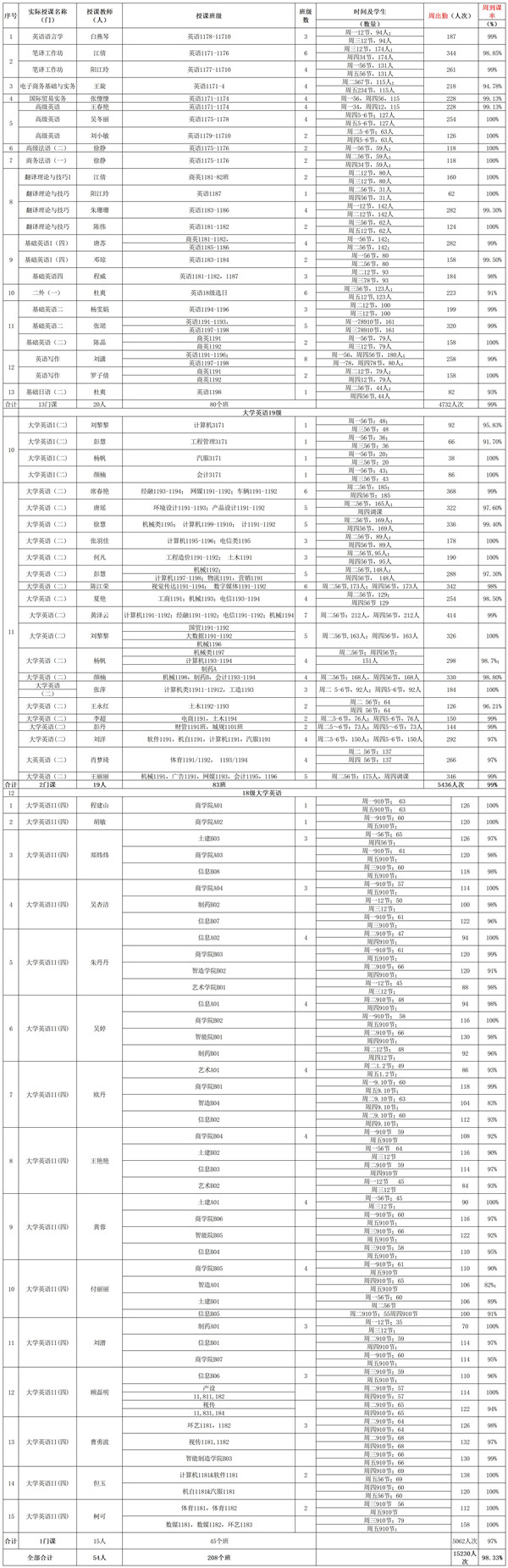 本周外国语学院开展网上教学进行到第5周。本周学院计划新开课程4门,实际新开课程4门:高级法语(二),商务法语(一),第二外语(日语)㈠,基础日语(二)。到目前为止计划在线教学开课全部顺利展开,本周实际授课门数16门。本周在线教学的教师人数为54人,开出的在线课程64门次;参加在线教学的学生人次数15230人次;到课率平均为98.33%。