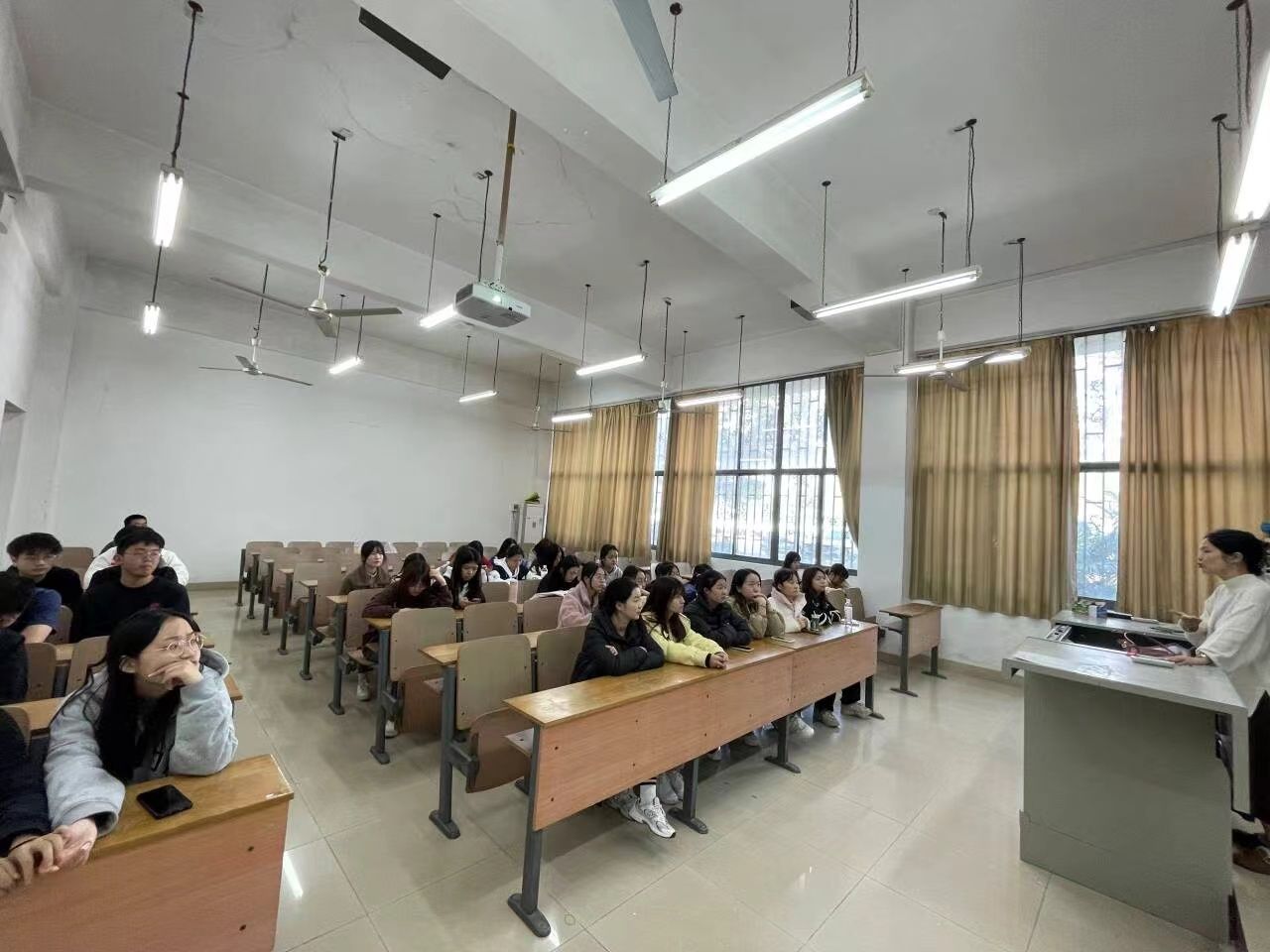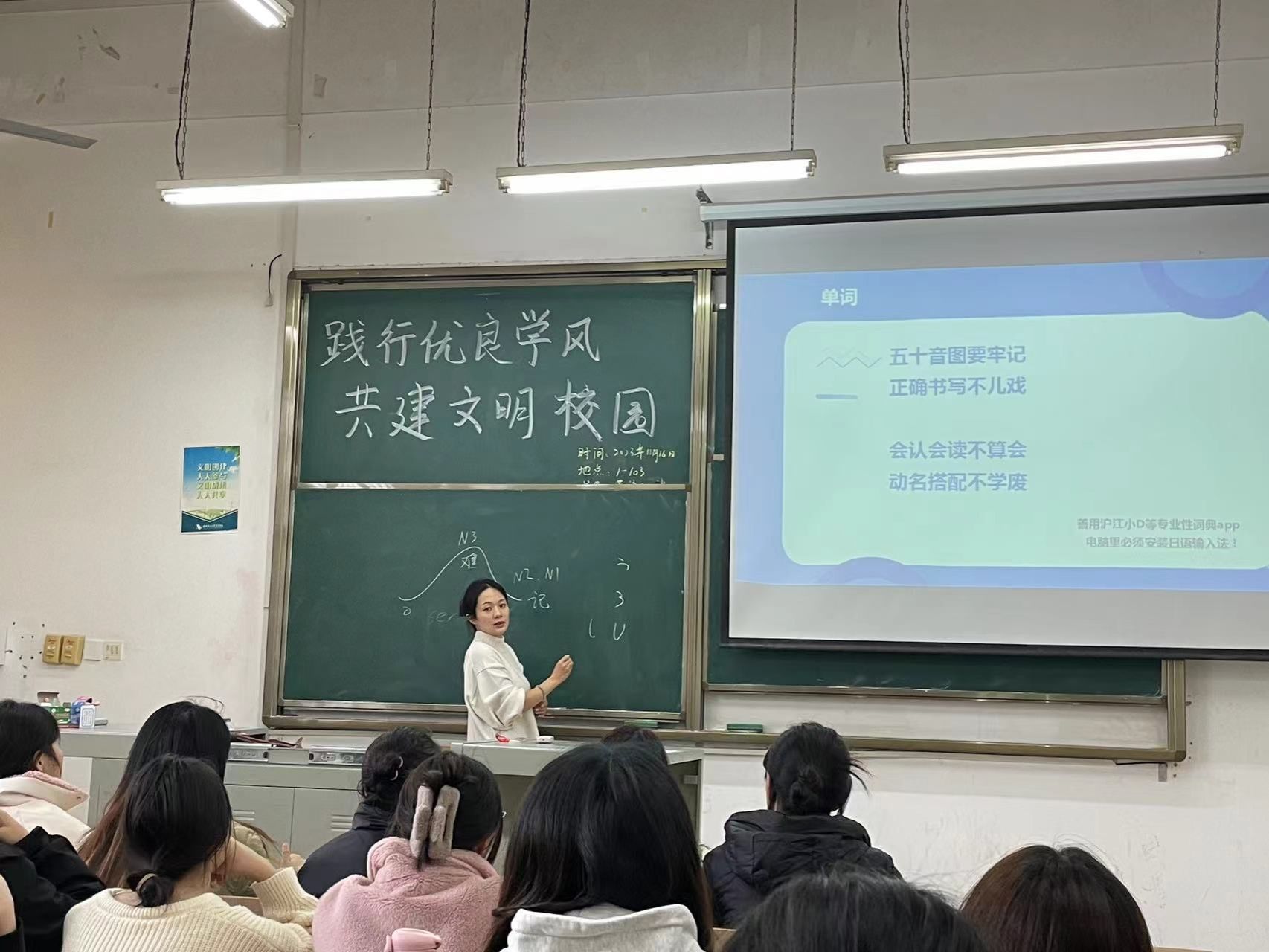 以英语系英日双语方向1222班的“践行优良学风,共建文明校园”主题班会为例。11月16日,1222班导师班主任陈潮涯在了解到同学们普遍存在单词记忆不牢固、语法运用不熟练、听说能力待提高等学习困难后,抓住午休间隙召开了主题班会,为学生们答疑解惑。针对课堂纪律不严的问题,提出大家应该规范化、仪式化课前准备工作,包括落实提前5分钟到课堂、禁止在教室内饮食、值日生擦黑板、班长带领全班起立等措施。在听课期间严禁不经老师允许使用手机,严禁利用课堂时间做其他课程作业,思维始终跟着老师教鞭走,以饱满、专注的精神状态上好每一堂课。
