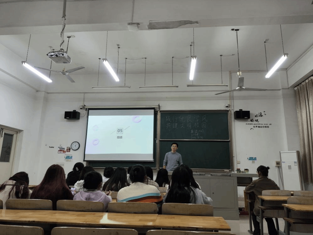 活动第二项,导师班主任史贵鹏老师为此次班会作出总结。他分别从实践活动、专业竞赛、专四、考研四个方面为同学们提出了有针对性的建议。建议同学们提前为自己的未来做好充分的规划和准备,把工作做在前面。同时,他还督促同学们一定不能松懈学习,强调扎实的专业知识储备将会在未来升学或找工作过程中提供极大的帮助。此外,史贵鹏老师还指出,同学们要在学业完成的前提下多参加实践活动、志愿服务活动、专业竞赛等,去创造美好丰富的大学生活,去感受绚烂多彩的人生。