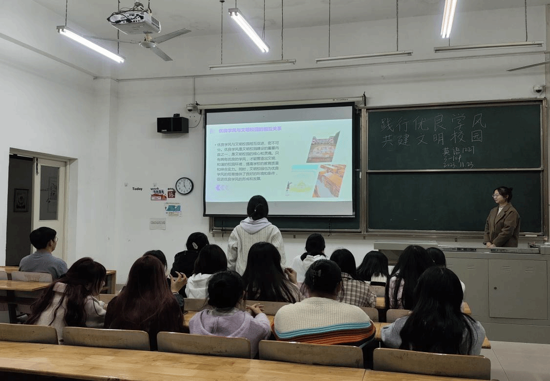 为了进一步端正学生的学习态度,促进学生养成良好的学习习惯,11月23日,英语1227班在导师班主任史贵鹏老师的组织下,召开了“践行优良学风,共建文明校园”的主题班会,此次活动由团支书刘莉主持,英语1227班全体同学参与。