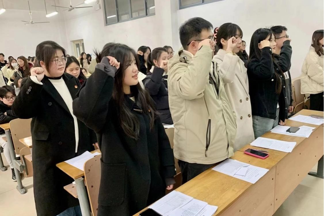 会议第三项,团支部书记罗雯雁汇报团员和青年主题教育开展情况,通报团支部委员会查找不足等情况。团支部书记罗雯雁、团支部副书记唐远仪等十余名团员依次发言,对以往工作进行总结并指出存在的不足。其他团员分别从自评、互评、组织评议三方面开展民主评议,评议机制分优秀、合格、基本合格、不合格四个等次,优秀率不得超过30%。全体团员起立,右手握拳,重温入团誓词。