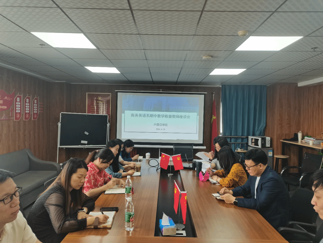 4月24日中午12:45,商务英语系在综合楼1102会议室召开期中教学检查教师座谈会。党委组织部汤雁副部长和韩笑主任、外语学院刘沛院长以及商务英语系全体教师和部分辅导员参加了会议。会议由商英系主任王春艳老师主持。