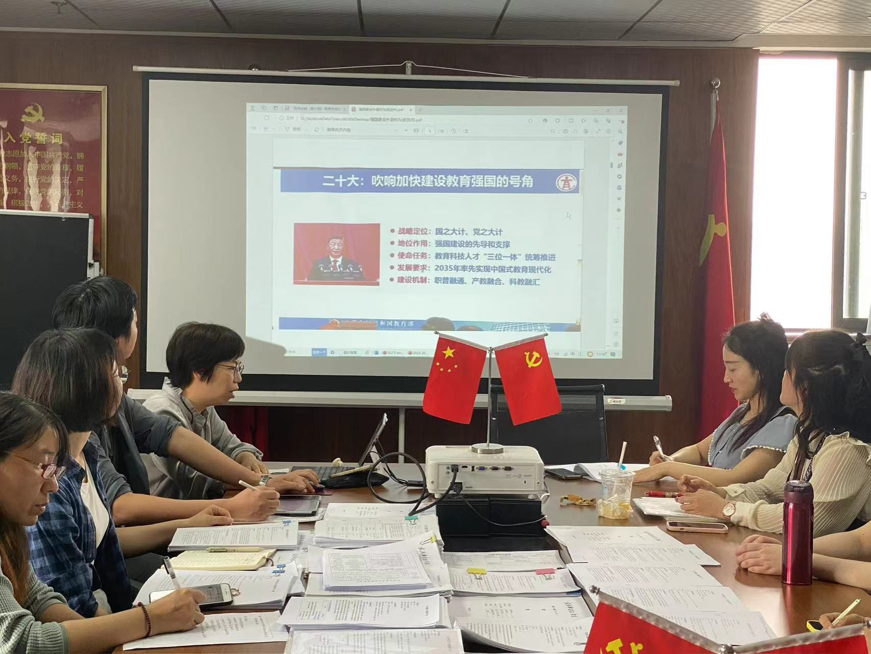 最后,会议还围绕“强国有我,外语何为”的主题进行了集中学习。教师们讨论了如何在实际工作中积极响应二十大的号召,加快建设教育强国,为推动高质量发展培养国家急需人才。教师们纷纷表示,将以此为动力,不断提升自身教学水平,为国家培养更多优秀外语人才。主题学习激发了教师们对教育强国建设的责任感和使命感,明确了外语教育在国家发展中的重要角色。