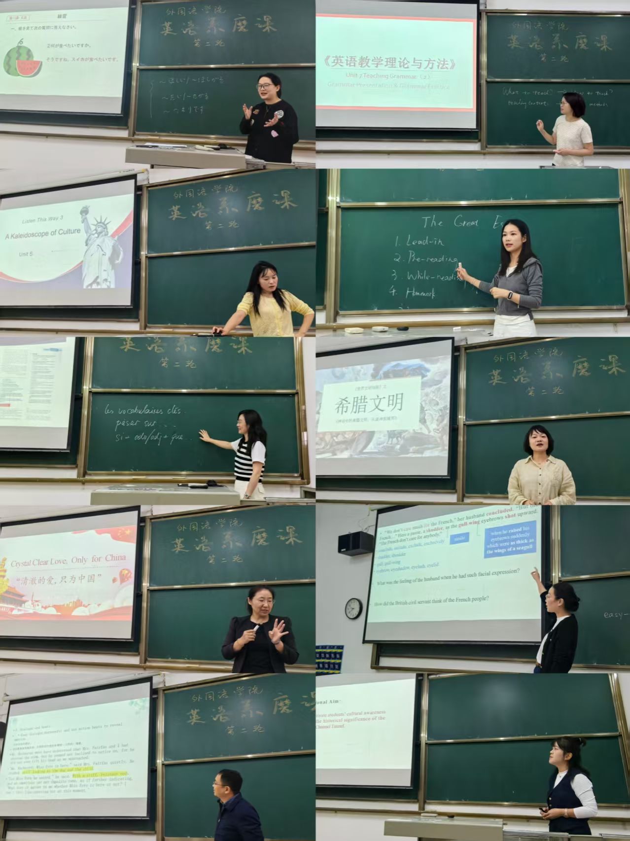 参与本次磨课活动的教师们展示了多门专业课程,涵盖了英语专业的各个领域。其中包括综合英语Ⅲ(三)、综合英语(五)、英语写作、汉英笔译、汉英口译、英美文学选读、英语国家社会与文化、英语教学理论与方法、毕业论文写作、英语视听说等专业课程。此外,小语种教师还展示了高级法语、法语阅读、高级日语、基础日语等课程,体现了外语教学的多元化特色。