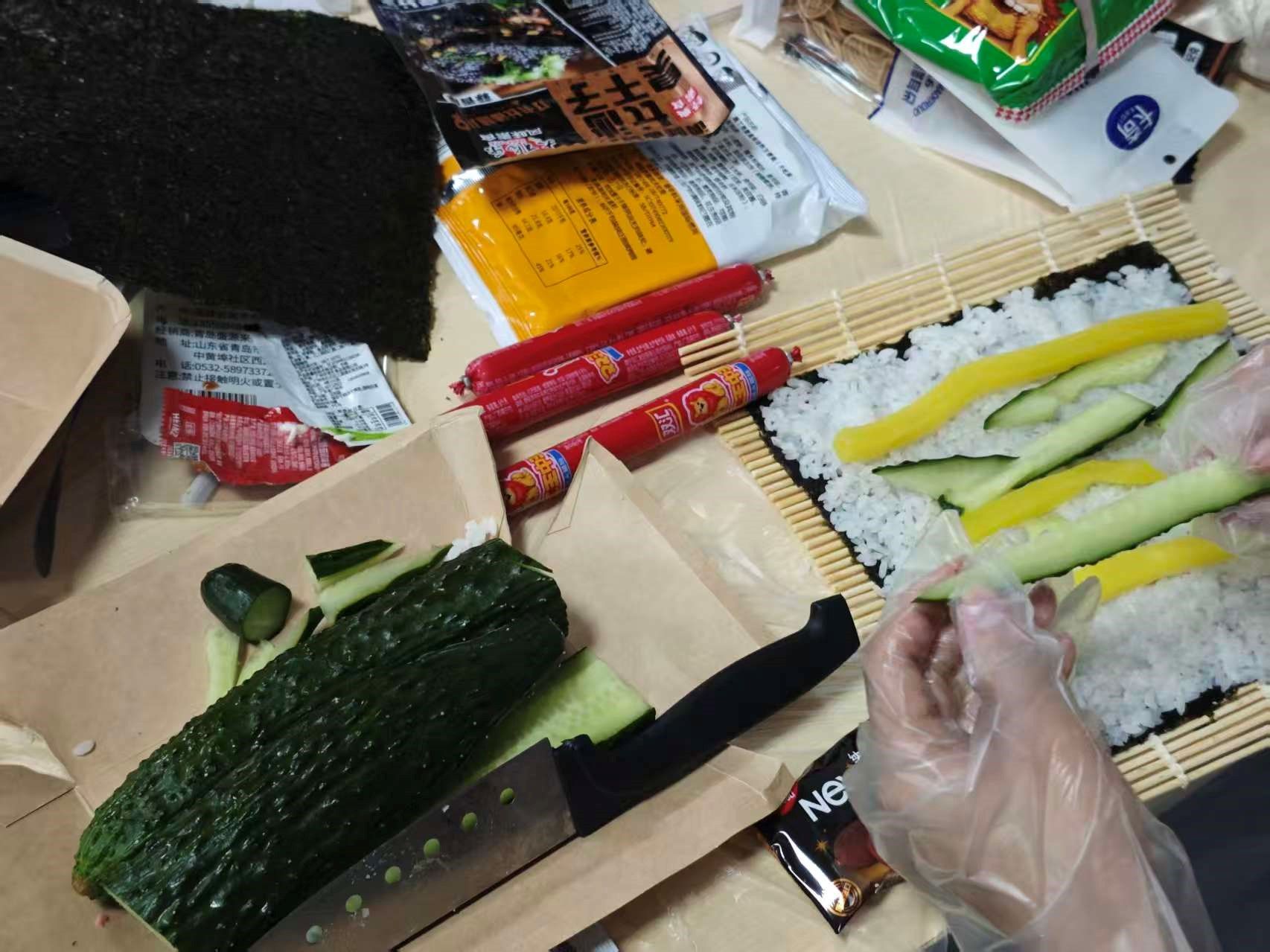 活动伊始,同学们迅速分组围坐,竹帘、海苔、米饭与各式配料整齐摆放。大家参照示例手法,小心翼翼地铺饭、放料、卷制,不时互相提醒“米饭要捏紧实些”“卷的时候力道要匀”,小组内笑语不断。当一个个形态各异的寿司切好装盘,同学们纷纷用日语分享成就感,动手过程成为了自然的语言实践。