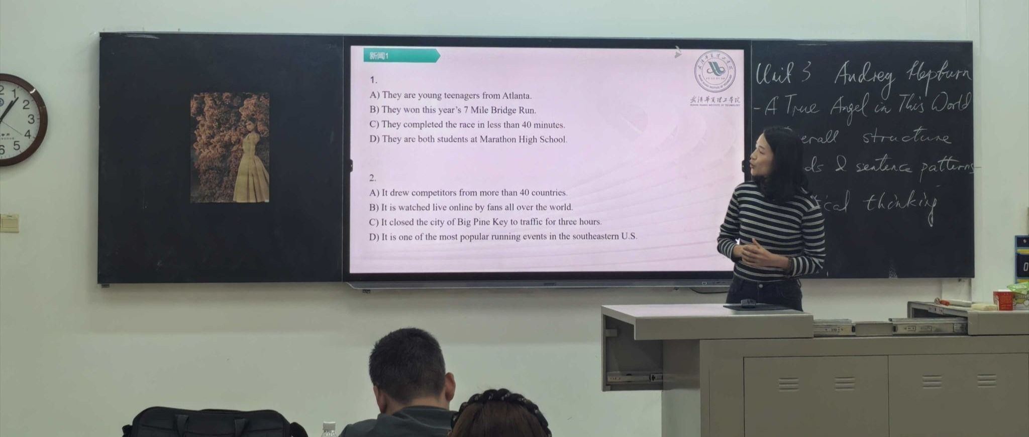 活动伊始,吴婷老师率先登台分享,围绕第三单元教学架构与四级完型填空题型进行细致分析讲解。她打破传统教学边界,将思政元素巧妙融入知识点讲解,引导学生在攻克语法、梳理文章逻辑的同时,树立正确的价值观与文化自信。