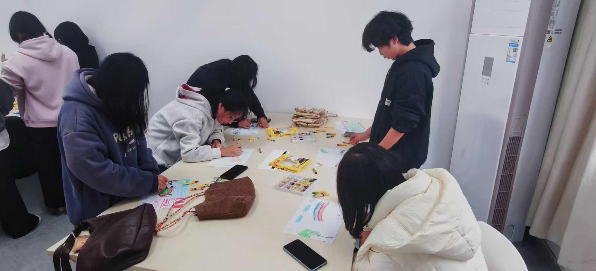 在同学们的笔下,朦胧的教学楼轮廓是未竟的期待,而更动人的是现实中彼此靠近的肩头与分享彩笔时指尖的轻触。这些细微的互动,正是外语学院学子善于沟通、珍视情谊的生动体现。他们将淡淡的个人遗憾,化为同窗共勉的温暖,让每一张画纸都浸染了集体的温度。