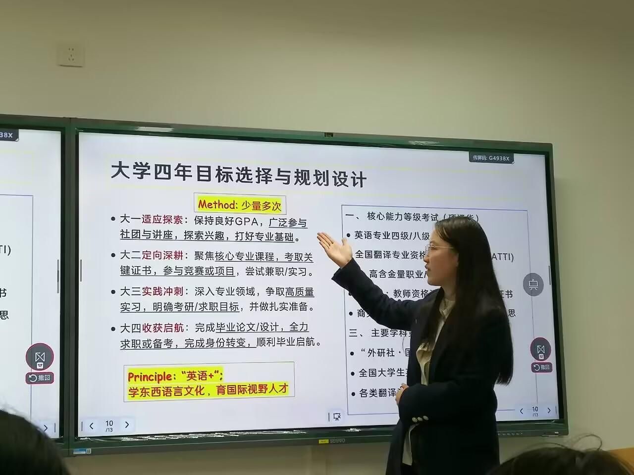 结合专业特点,她像一位学姐那样,和大家细致讲解了大学四年的目标规划,从大一的适应探索到毕业前的收获启航,给出了许多实在的建议。