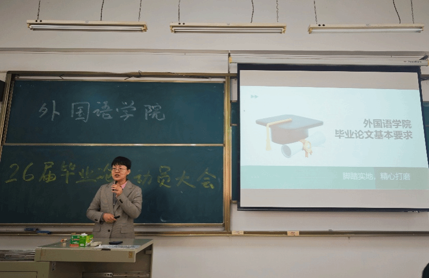 外国语学院刘沛院长首先给2026届毕业生作动员讲话,要求学生们认真对待毕业论文写作,他指出毕业论文写作是毕业生非常重要的一项任务,撰写毕业论文的过程也是梳理自己四年来学习内容的过程,更是为四年的大学学习生活交上一份重要的答卷。随后白燕琴副院长讲解了论文写作具体要求,就选题、开题报告、论文撰写、格式要求等各方面进行了讲解与说明,参加会议的学生代表们认真聆听两位院长的讲话,收获颇多。
