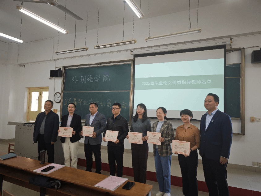 2025年11月14日全院毕业论文指导老师和学生代表在教学楼1-301参加了2026届毕业论文写作动员大会,暨2026届指导教师聘任大会。本次会议议程为:毕业论文工作总动员,论文写作具体要求,论文写作时间安排,宣布2025届毕业论文优秀指导教师名单并颁奖,宣布2026届毕业论文指导教师和被指导学生的名单,并给指导教师颁发聘书。