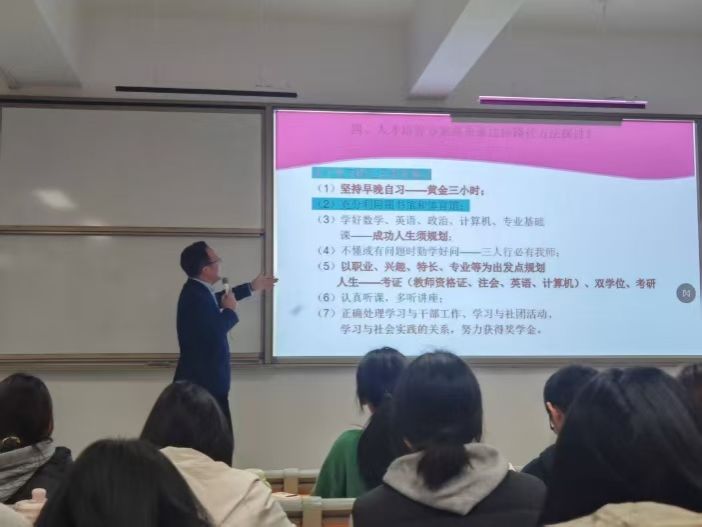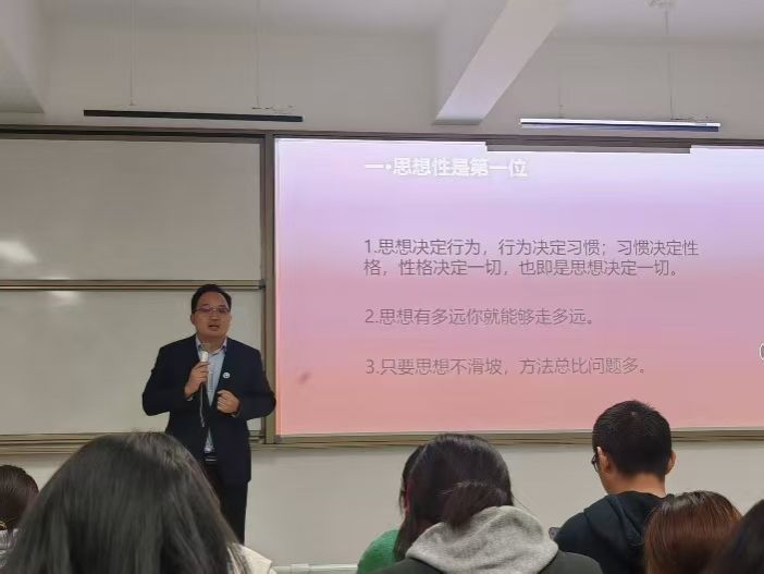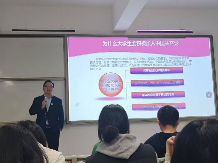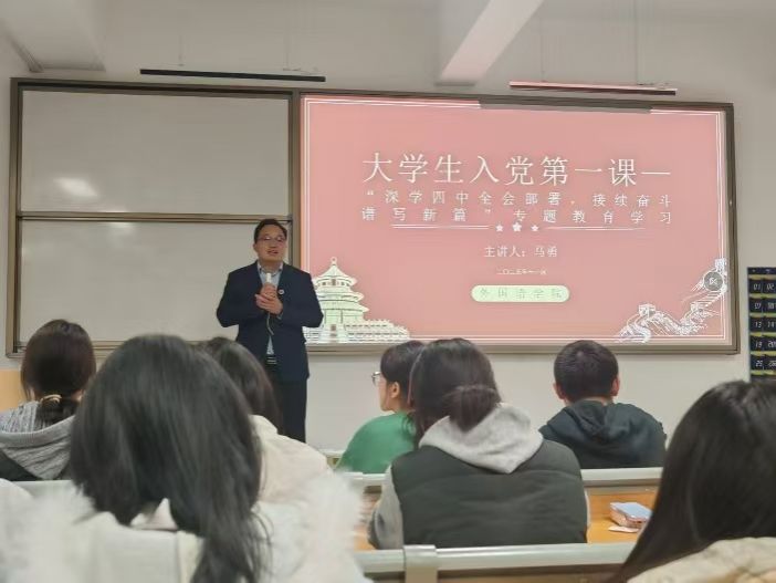 为帮助2025级新生筑牢信仰之基、明晰入党初心,近日,武汉华夏理工学院外国语学院党总支副书记马勇在梧桐湖校区C217教室,为新生讲授以“深学四中全会部署,接续奋斗谱写新篇”为主题的入党启蒙第一课。课程于18时30分正式开始,19时30分圆满结束,为新生们开启了思想入党的初心之旅。