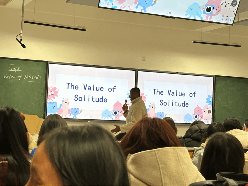 在当今快节奏、高度互联的社会中,如何在社交活动与个人空间之间找到平衡?11月17日,一场以“独处的价值”为主题的英语角活动于当晚18:30成功举办,为参与的同学们提供了一个深入思考与交流的平台。在外教Tapiwa的引导下,同学们通过一系列精心设计的互动环节,亲身体验了“孤独”与“独处”的区别,并认识到独处对个人成长的重要意义。
