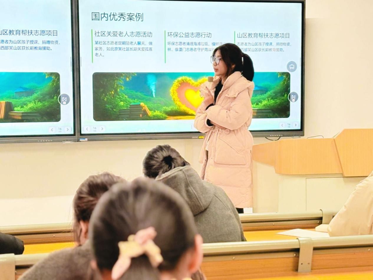 活动中,多位同学依次登台,结合“志愿与文明”的主题展开分享。有的同学通过“社区关爱老人”“环保公益行动”“山区教育帮扶”等国内优秀志愿案例,讲述了志愿服务如何为社会带来温暖与改变;有的同学聚焦“树文明新风”,阐释“风化天下、传颂芬芳”的内涵,呼吁大家从日常小事践行文明理念;还有同学围绕“认知—榜样—行动”的脉络,分享校园志愿现场的点滴,并提出青年参与志愿、践行文明的日常路径。