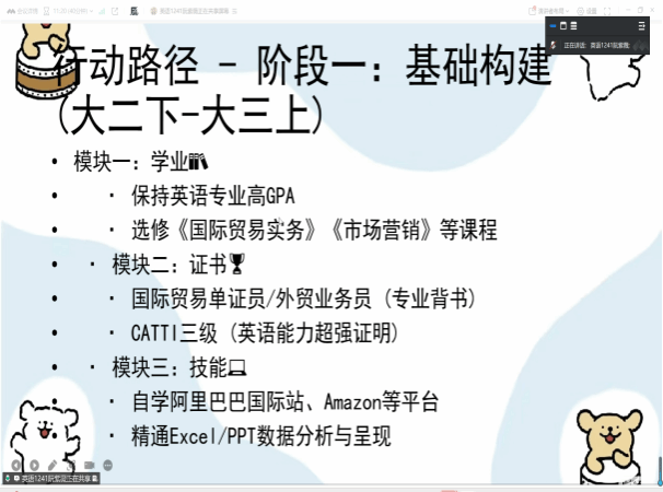 就业赛道的商英1221班陈世杰同学,聚焦教育和翻译岗位需求,结合专业语言能力,构建了从大学到职场的进阶路径;成长赛道的选手们则围绕“学业深造+职业储备”双向布局——英语1232班金紫亦同学怀教育初心,明确职业方向;英语1243班向宇同学展未来视野,勾勒“语言管道”到“商业建筑师”的进阶路径;英语1254班孟夏同学践“英语+复合”理念,以“英语+法学”铺就独特职业赛道。