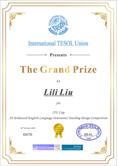 近日,在国际TESOL联盟举办的“人工智能赋能英语教学课程教案征集活动”中,外国语学院刘黎黎老师以其精心设计的教案《文化遗产:传统与创新》荣获特等奖(Grand Prize)。